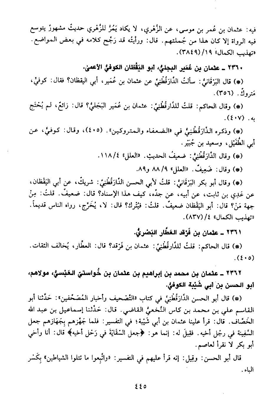 • وقال الحاكم: قلتُ للدَّارَقُطْنِيِّ عثمان بن عمير البجلي؟ قال زائغ، لم يحتج به. (407) .