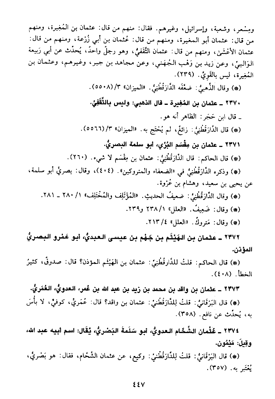 • قال الحاكم: قلتُ للدَّارَقُطْنِيِّ عثمان بن الهيثم المؤذن؟ قال صدوق، كثير الخطأ. (408) .