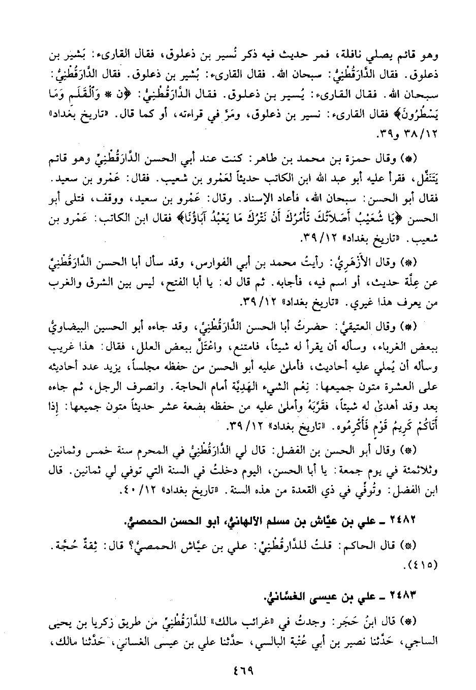 • وقال حمزة بن محمد بن طاهر كنت عند أبي الحسن الدَّارَقُطْنِيّ وهو قائم يتنفل، فقرأ عليه أبو عبد الله ابن الكاتب حديثًا لعمرو بن شعيب، فقال: عمرو بن سعيد، فقال: أبو الحسن سبحان الله، فأعاد الإسناد، وقال عمرو بن سعيد، ووقف، فتلى أبو الحسن " يا شعيب أصلاتك تأمرك أن نترك ما يعبد أباؤنا" فقال: ابن الكاتب عمرو بن شعيب. «تاريخ بغداد» 12 39.
