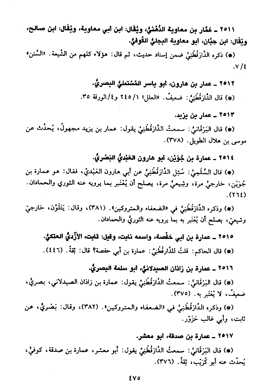 • قال البَرْقانِيّ: سَمِعْتُ الدَّارَقُطْنِيّ يقول عمارة بن زاذان الصيدلاني، بصري ضعيف، لا يعتبر به. (375) .