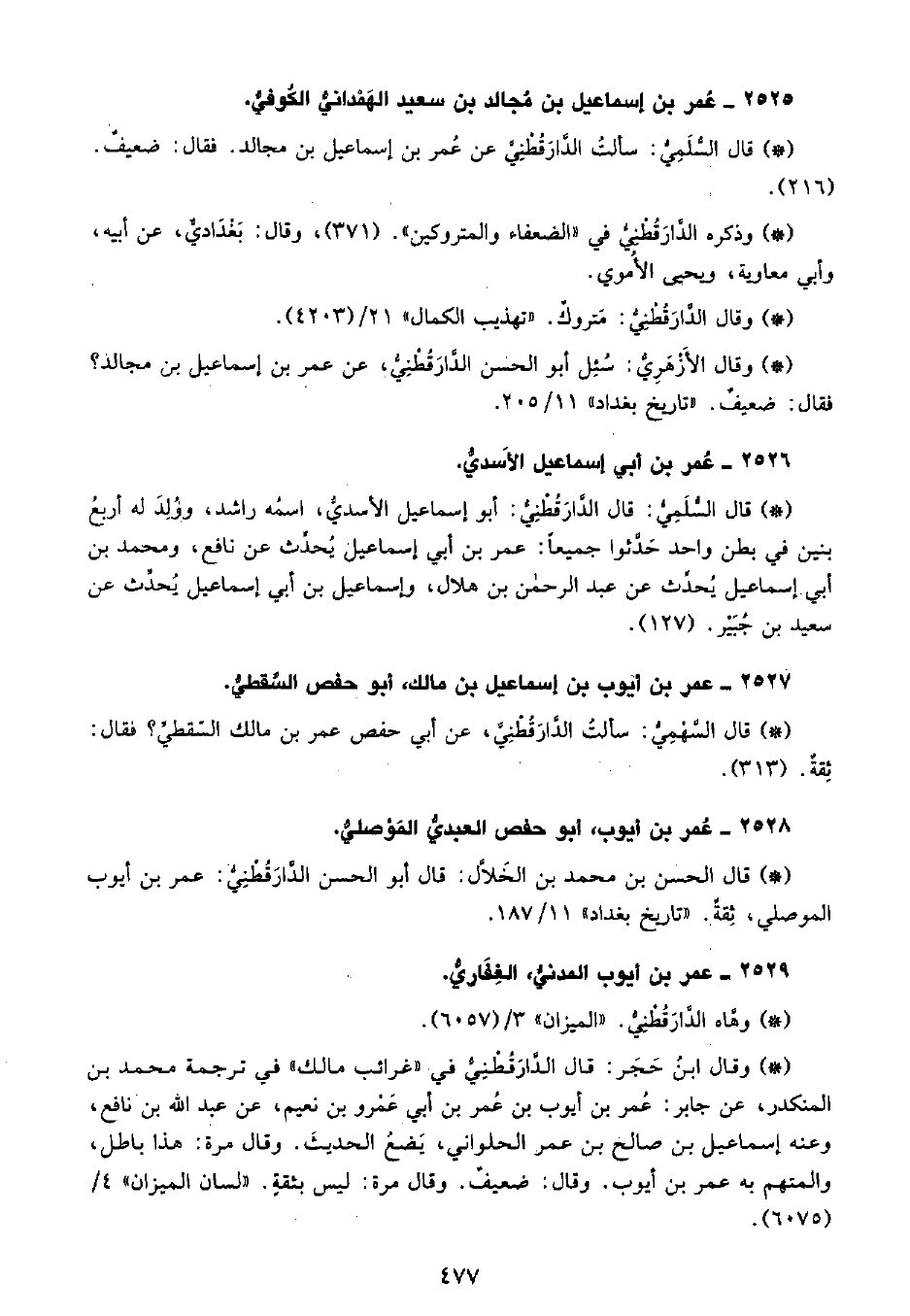 • وقال الأزهري: سئل أبو الحسن الدَّارَقُطْنِيّ، عن عمر بن إسماعيل بن مجالد؟ فقال: ضعيف. «تاريخ بغداد» 11 205.