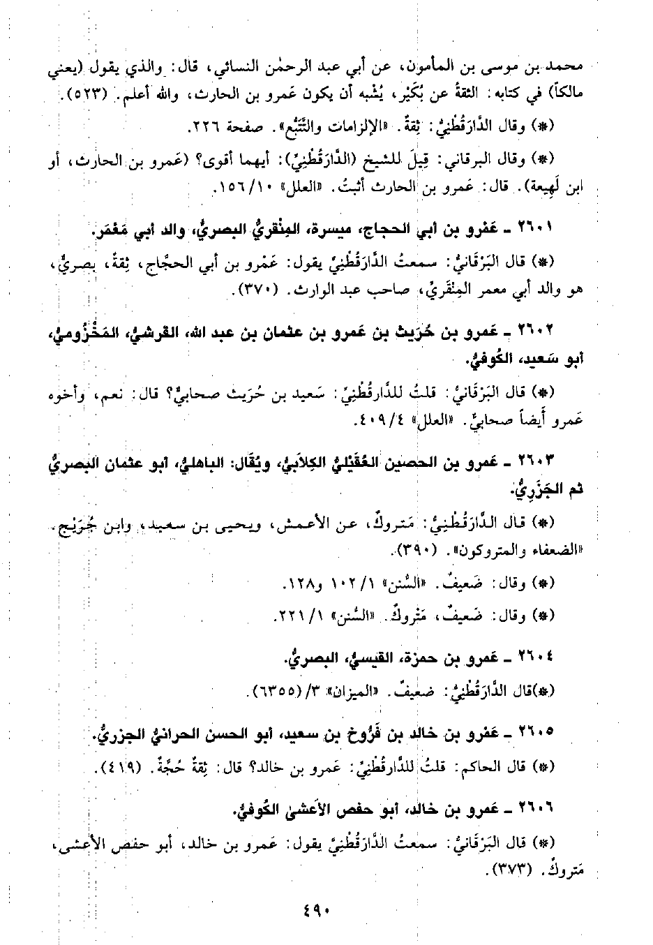 • قال البَرْقانِيّ: سَمِعْتُ الدَّارَقُطْنِيّ يقول عمرو بن أبي الحجاج، ثقة، بصري، هو والد أبي معمر المنقري، صاحب عبد الوارث. (370) .