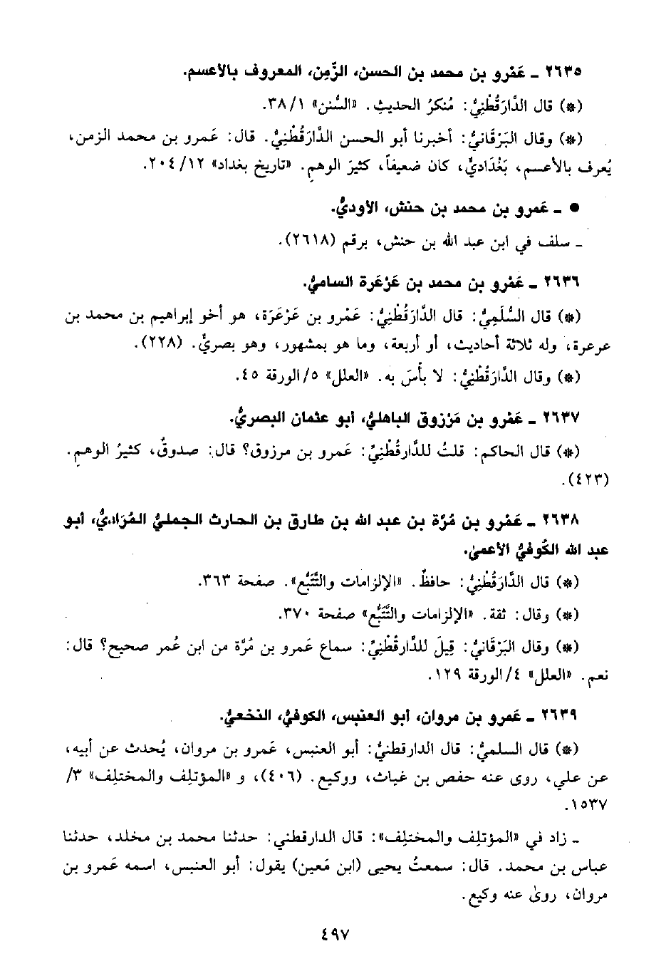 • وقال البَرْقانِيّ: أخبرنا أبو الحسن الدَّارَقُطْنِيّ، قال عمرو بن محمد الزمن، يعرف بالأعسم، بغدادي، كان ضعيفًا، كثير الوهم. «تاريخ بغداد» 12 204.