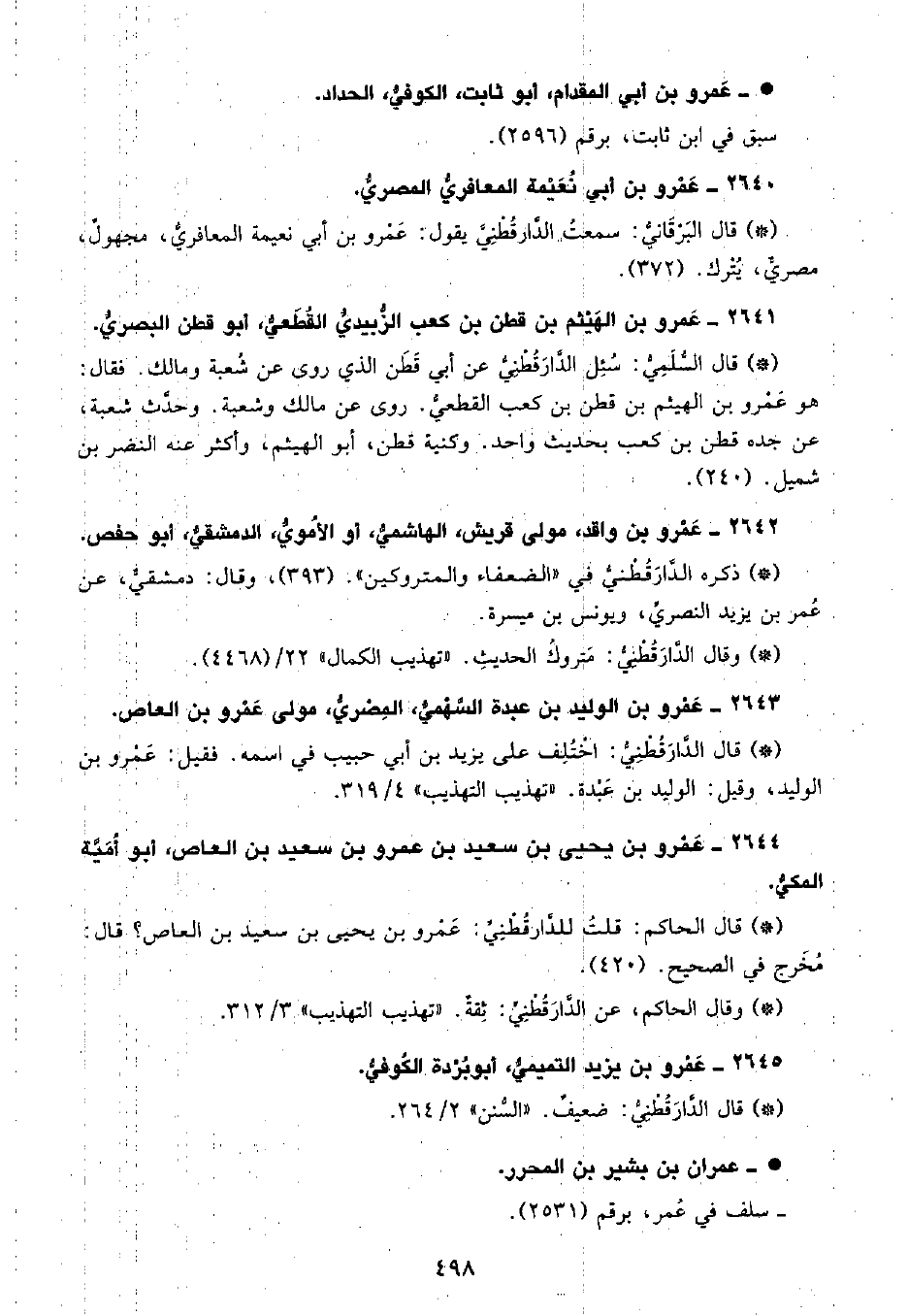 • قال البَرْقانِيّ: سَمِعْتُ الدَّارَقُطْنِيّ يقول عمرو بن أبي نعيمة المعافري، مجهول، مصري، يترك. (372) .