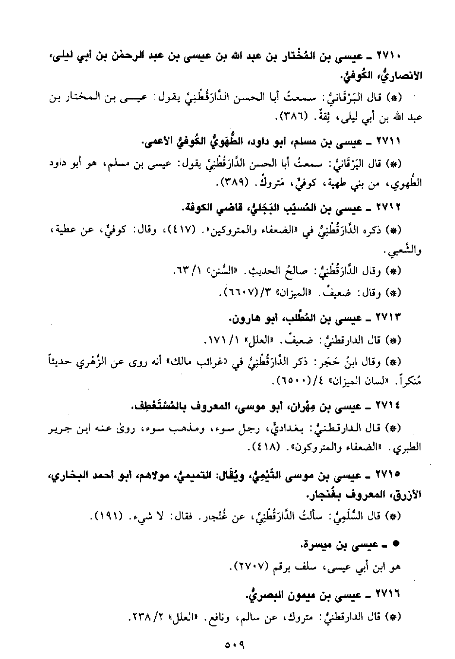 • قال البَرْقانِيّ: سَمِعْتُ أبا الحسن الدَّارَقُطْنِيّ يقول عيسى بن مسلم، هو أبو داود الطهوى، من بني طهية، كوفي متروك. (389) .