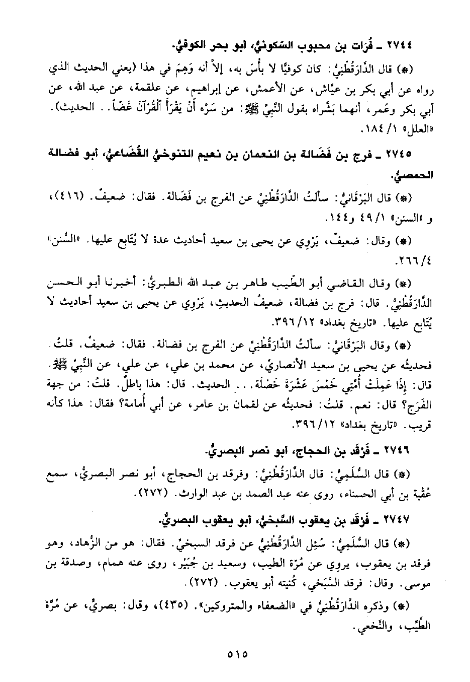 • قال السُّلَمِيُّ: قال الدَّارَقُطْنِيّ: وفرقد بن الحجاج، أبو نصر، البَصْرِيّ، سمع عقبة بن أبي الحسناء، روى عنه عبد الصمد بن عبد الوارث. (272) .