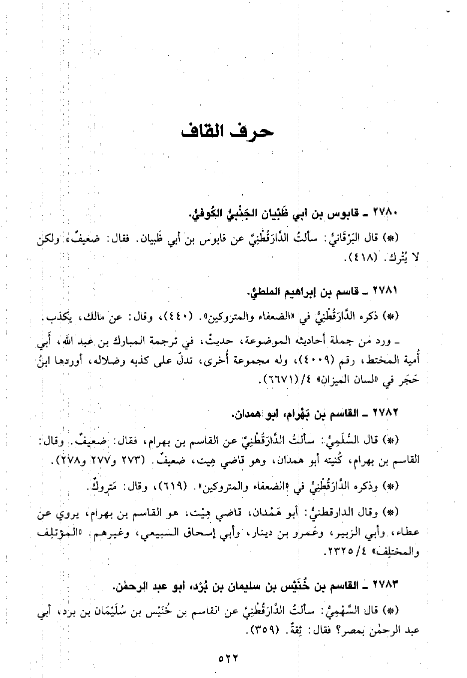 • قال السُّلَمِيُّ: سألت الدَّارَقُطْنِيّ عن القاسم بن بهرام، فقال: ضعيف، وقال القاسم بن بهرام، كنيته أبو همدان، وهو قاضي هيت، ضعيف. (273 و277 و278) .