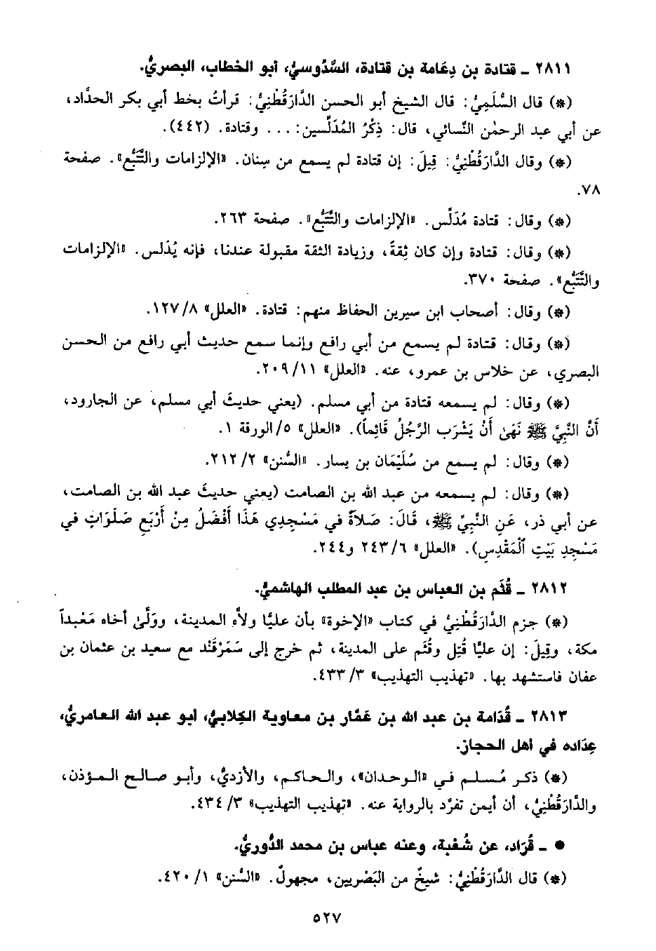 • قال السُّلَمِيُّ: قال الشيخ أبو الحسن الدَّارَقُطْنِيّ قرأت بخط أبي بكر الحداد عن أبي عبد الرحمن النسائي، قال ذكر المدلسين ... وقتادة. (442) .