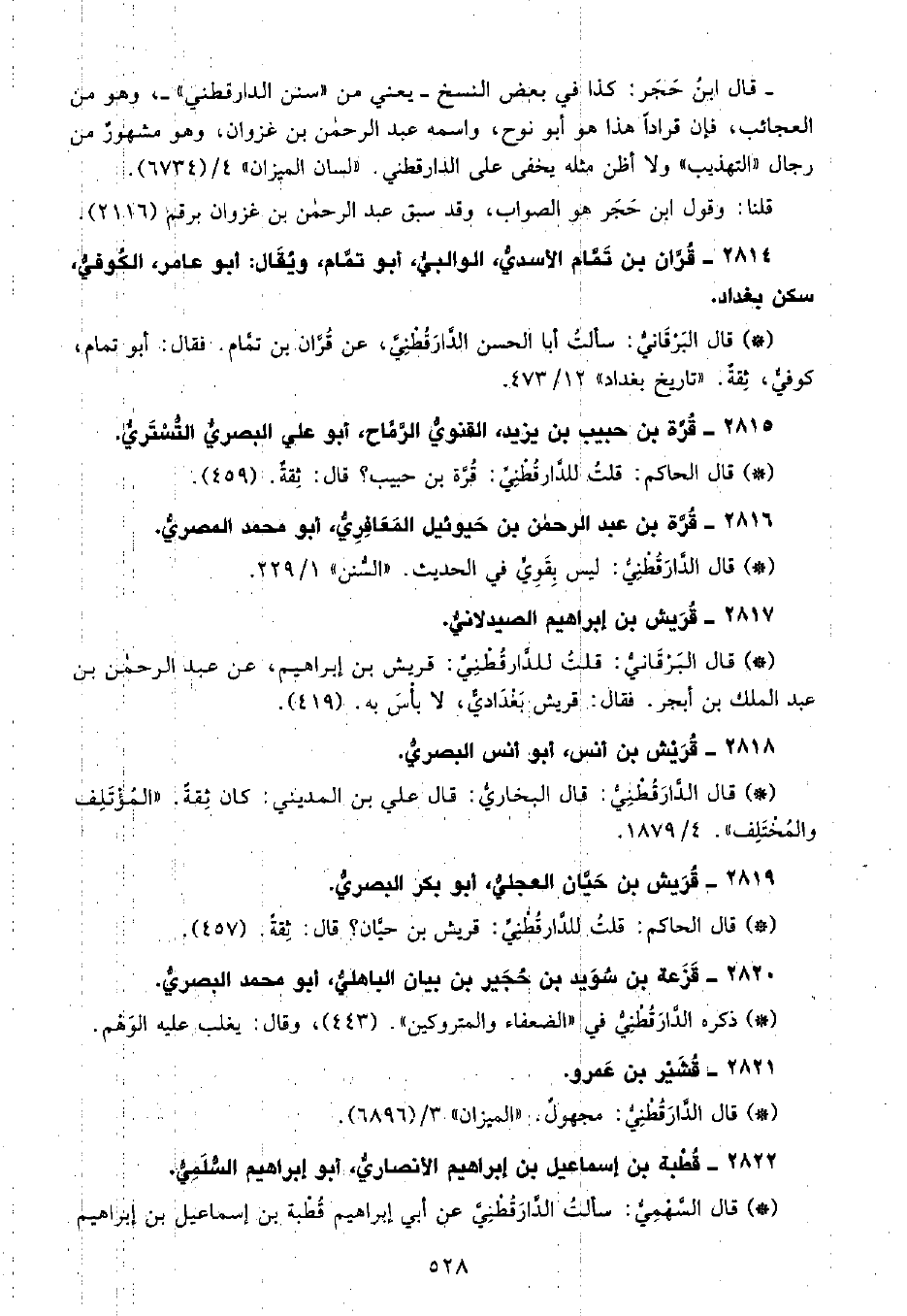 • قال البَرْقانِيّ: قلتُ للدَّارَقُطْنِيِّ قريش بن إبراهيم، عن عبد الرحمن بن عبد الملك بن أبجر، فقال: قريش بغدادي، لا بأس به. (419) .