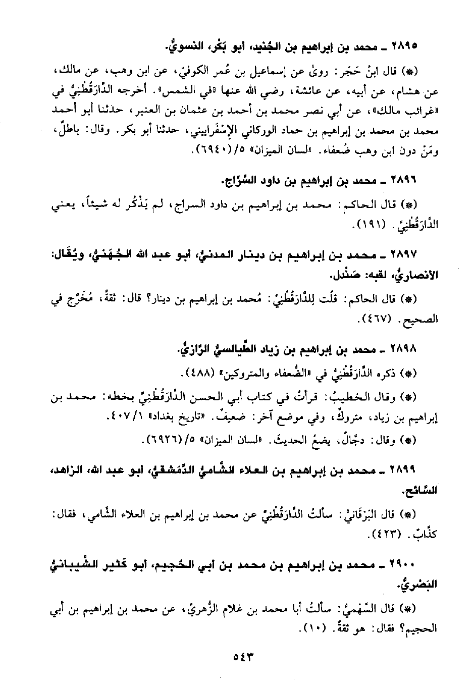 • قال الحاكم: محمد بن إبراهيم بن داود السراج، لم يذكر له شيئًا، يعني الدَّارَقُطْنِيّ. (191) .