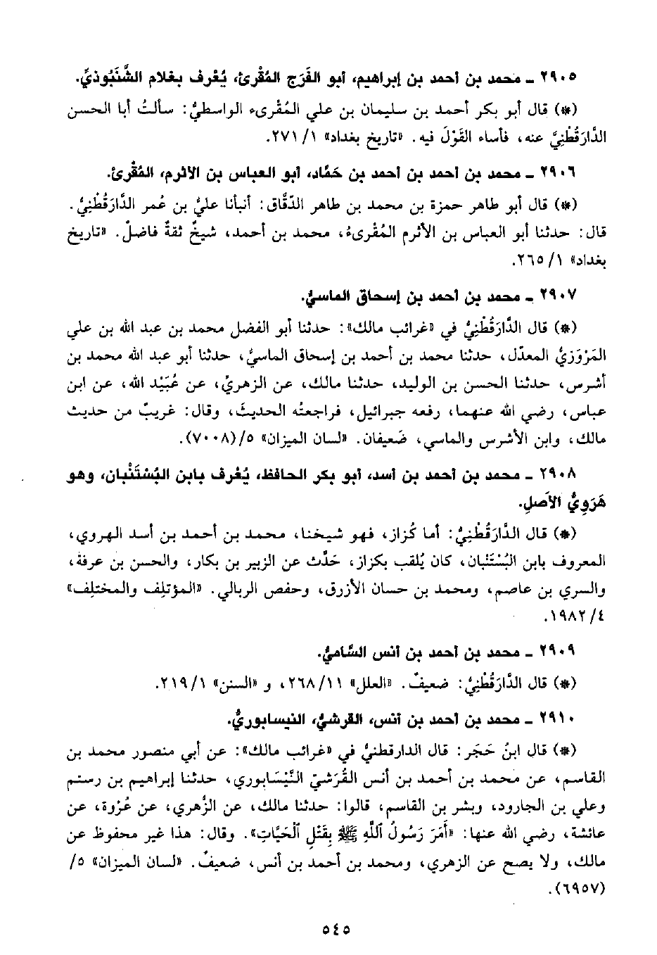 • قال ابن حجر: قال الدَّارَقُطْنِيّ: في «غرائب مالك» عن أبي منصور محمد بن القاسم، عن محمد بن أحمد بن أنس، القُرَشِيّ النيسابوري، حدثنا إبراهيم بن رستم، وعلي بن الجارود، وبشر بن القاسم قالوا حدثنا مالك، عن الزهري، عن عروة، عن عائشة، رضي الله عنها «أمر رسول الله - صلى الله عليه وسلم - بقتل الحيات» ، وقال هذا غير محفوظ عن مالك، ولا يصح عن الزهري، ومحمد بن أحمد بن أنس، ضعيف. «لسان الميزان» 5 (6957) .