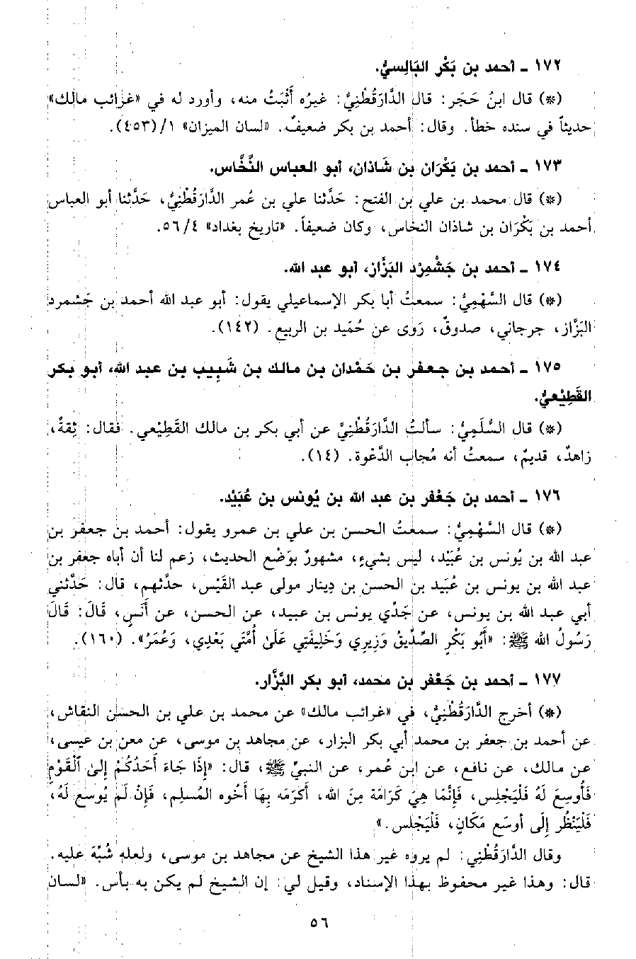 • قال محمد بن علي بن الفتح حدثنا علي بن عمر الدَّارَقُطْنِيّ، حدثنا أبو العباس أحمد بن بكران بن شاذان النخاس، وكان ضعيفًا. «تاريخ بغداد» 4 56.