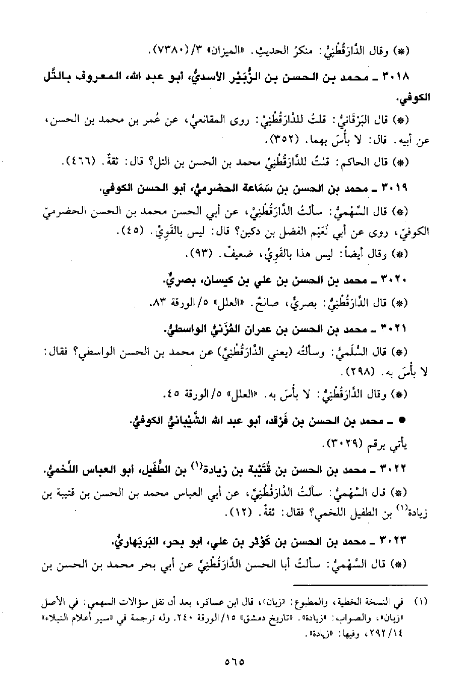 • قال السهمي: سألت الدَّارَقُطْنِيّ عن أبي الحسن محمد بن الحسن الحضرمي، الكُوفِيّ، روى عن أبي نعيم الفضل بن دكين؟ قال ليس بالقوي. (45) .
