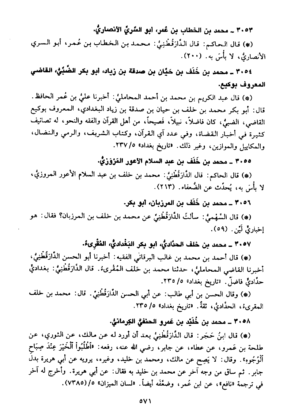 • قال السهمي: سألت الدَّارَقُطْنِيّ عن محمد بن خلف بن المرزبان؟ فقال: هو إخباري لين. (59) .