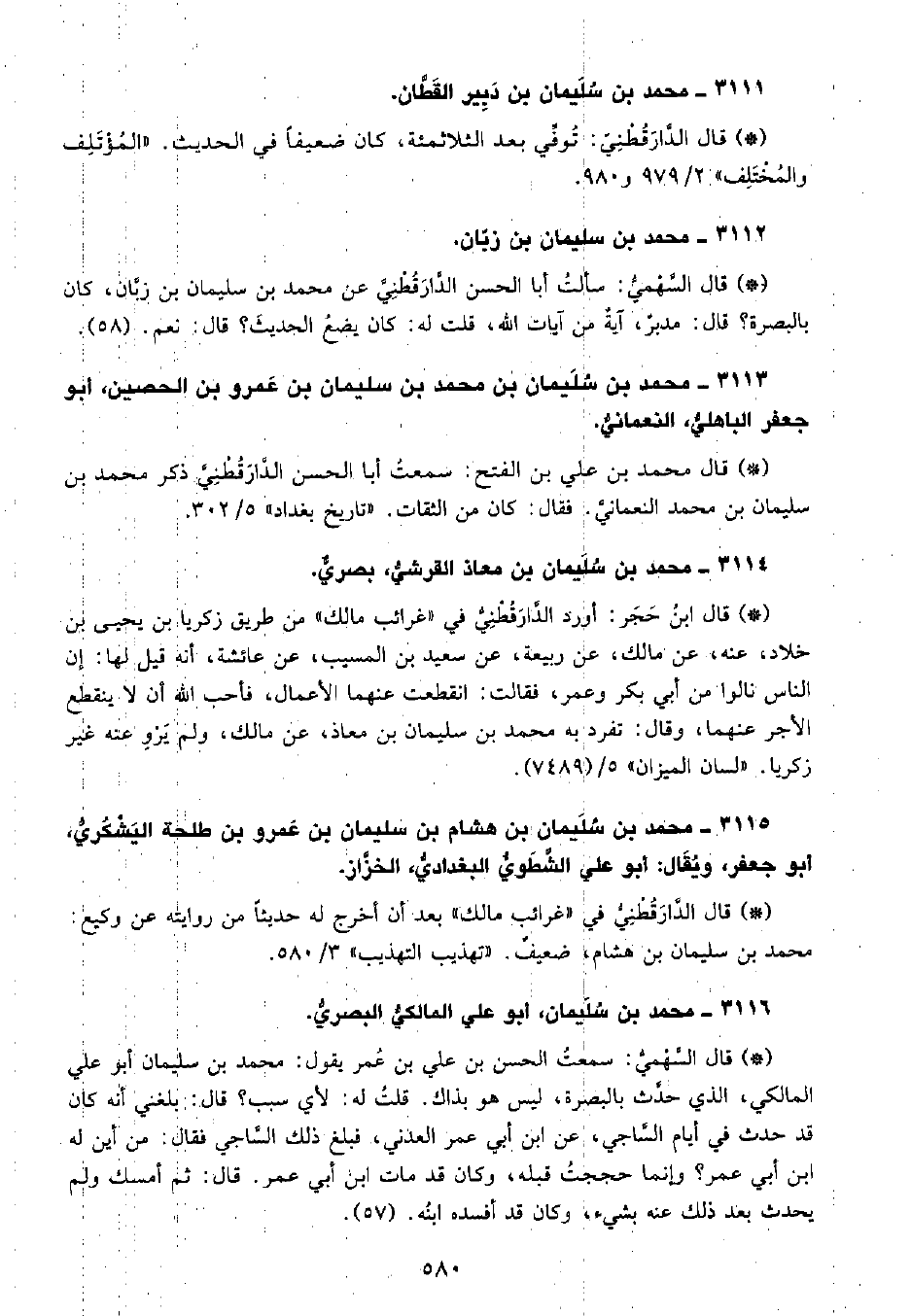 • قال محمد بن علي بن الفتح سَمِعْتُ أبا الحسن الدَّارَقُطْنِيّ ذكر محمد بن سليمان بن محمد النعماني، فقال: كان من الثقات. «تاريخ بغداد» 5 302.