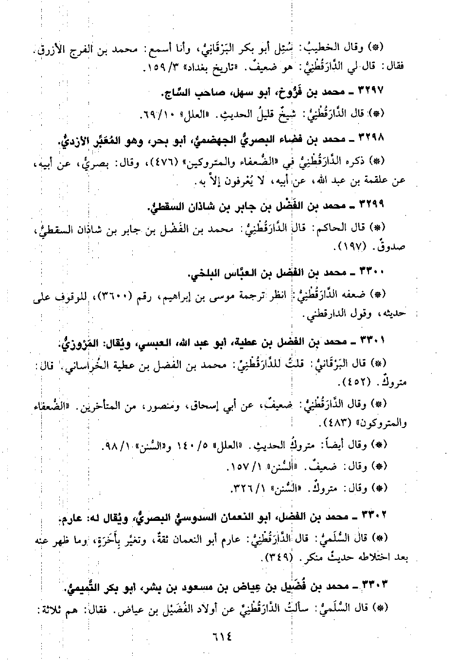 • قال الحاكم: قال الدَّارَقُطْنِيّ: محمد بن الفضل بن جابر بن شاذان السقطي، صدوق. (197) .