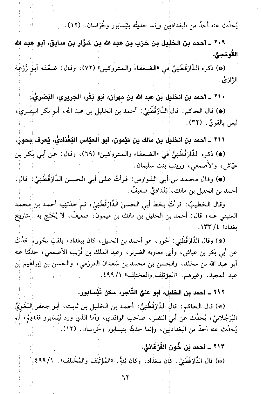 • قال الحاكم: قال الدَّارَقُطْنِيّ: أحمد بن الخليل بن عبد الله، أبو بكر البصري، ليس بالقوي. (32) .