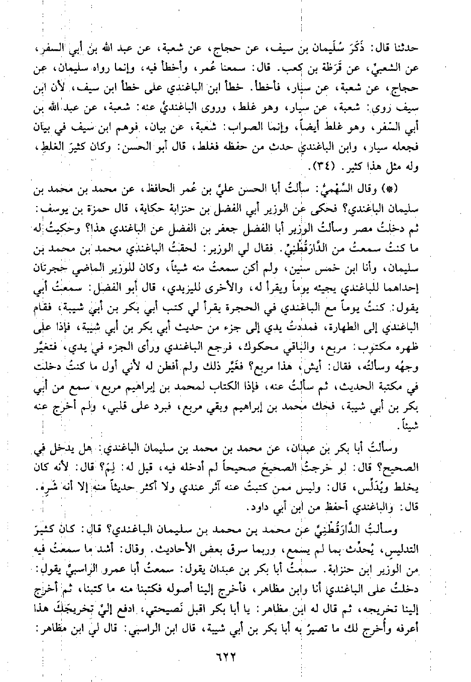 • وقال السهمي: سألت أبا الحسن علي بن عمر الحافظ، عن محمد بن محمد بن سليمان الباغندي؟ فحكى عن الوزير أبي الفضل بن حنزابة حكاية، قال حمزة بن يوسف ثم دخلت مصر وسألت الوزير أبا الفضل جعفر بن الفضل عن الباغندي هذا؟ وحكيت له ما كنت سَمِعْتُ من الدَّارَقُطْنِيّ، فقال: لي الوزير لحقت الباغندي محمد بن محمد بن سليمان، وأنا ابن خمس سنين، ولم أكن سَمِعْتُ منه شيئًا، وكان للوزير الماضي حجرتان إحداهما للباغندي يجيئه يومًا ويقرأ له، والأخرى لليزيدي، قال أبو الفضل سَمِعْتُ أبي يقول كنت يومًا مع الباغندي في الحجرة يقرأ لي كتب أبي بكر بن أبي شيبة، فقام الباغندي إلى الطهارة، فمدت يدي إلى جزء من حديث أبي بكر بن أبي شيبة، فإذا على ظهره مكتوب مربع، والباقي محكوك، فرجع الباغندي ورأى الجزء في يدي، فتغير وجهه وسألته فقال: أيش هذا مربع؟ فغير ذلك ولم أفطن له لأني أول ما كنت دخلت في مكتبة الحديث ثم سألت عنه، فإذا الكتاب لمحمد بن إبراهيم مربع، سمع من أبي بكر بن أبي شيبة، فحك محمد بن إبراهيم وبقي مربع، فبرد على قلبي، ولم أخرج عنه شيئًا.