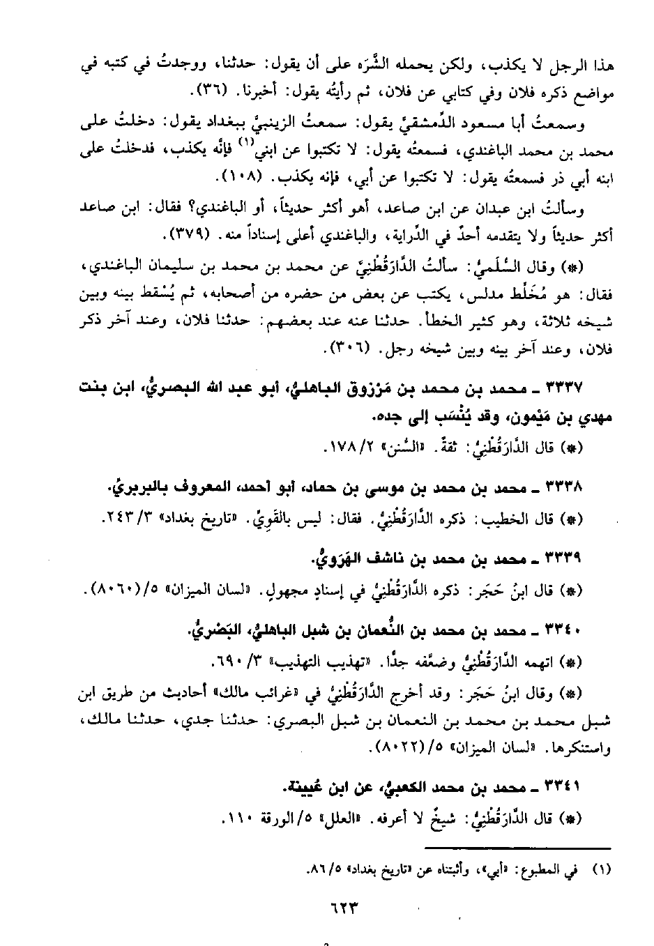 • وقال السُّلَمِيُّ: سألت الدَّارَقُطْنِيّ عن محمد بن محمد بن سليمان الباغندي، فقال: هو مخلط مدلس، يكتب عن بعض من حضره من أصحابه، ثم يسقط بينه وبين شيخه ثلاثة، وهو كتير الخطأ، حدثنا عنه عند بعضهم حدثنا فلان، وعند أخر ذكر فلان، وعند آخر بينه وبين شيخه رجل. (306) .