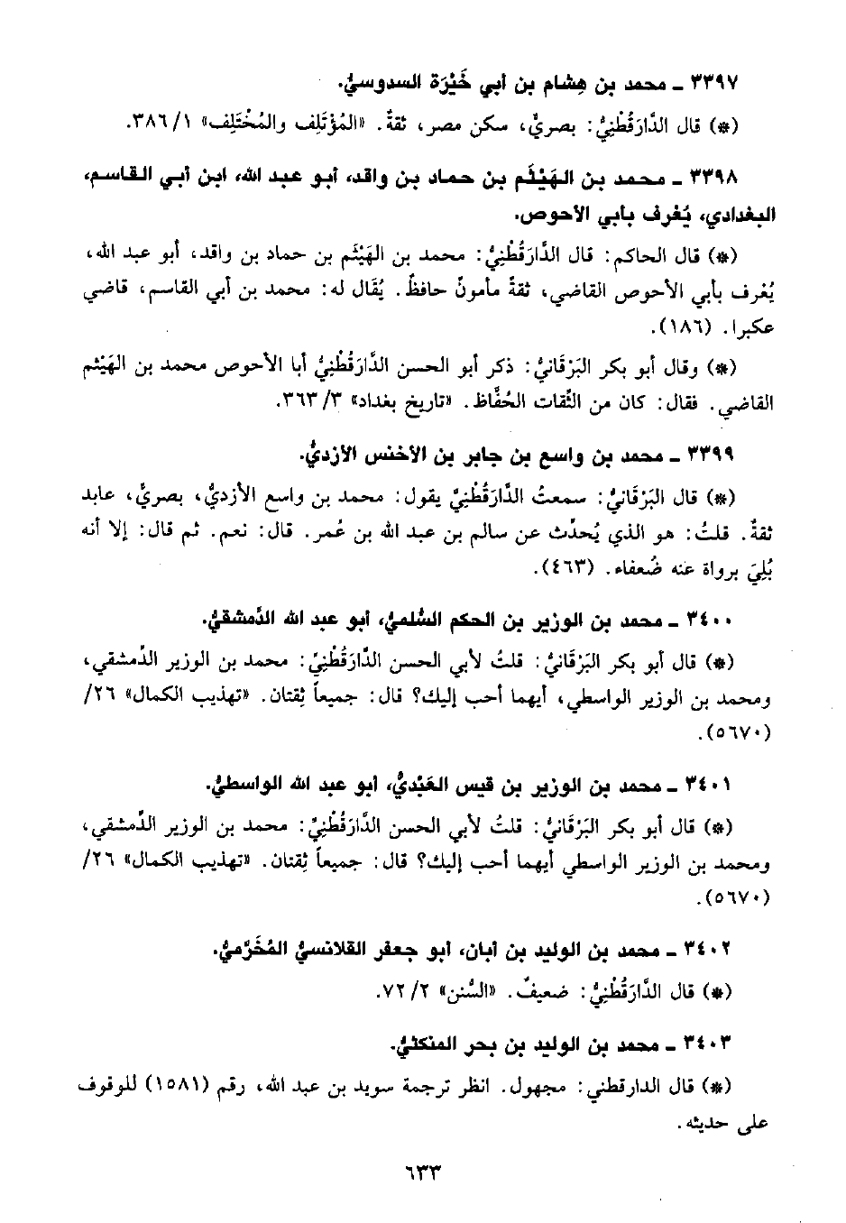 • قال أبو بكر البَرْقانِيّ قلتُ لأبي الحسن الدَّارَقُطْنِيّ محمد بن الوزير الدمشقي، ومحمد بن الوزير الواسطي أيهما أحب إليك؟ قال جميعًا ثقتان. «تهذيب الكمال» 26 (5670) .
