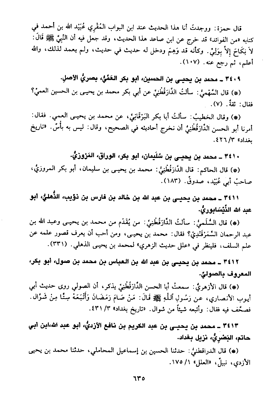 • قال الدراقطني حدثنا الحسين بن إسماعيل المحاملي، حدثنا محمد بن يحيى الأزدي، نبيل. «العلل» 1 175.