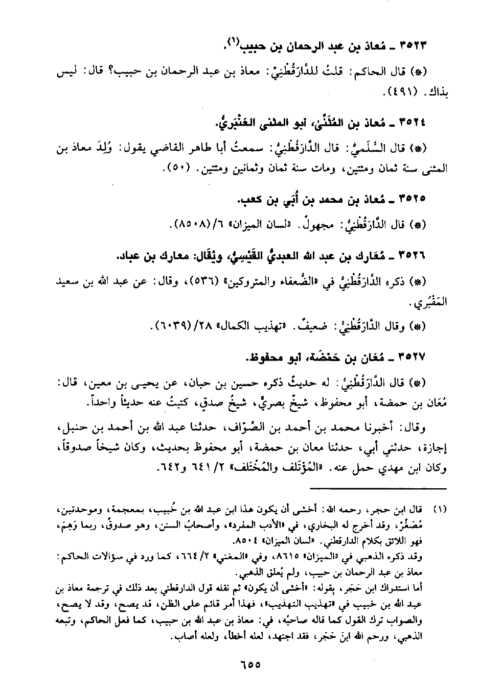 • قال الحاكم: قلتُ للدَّارَقُطْنِيِّ مُعاذ بن عبد الرحمن بن حبيب؟ قال ليس بذاك. (491) .