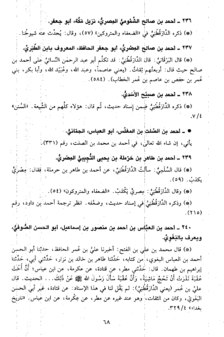• قال السلمي: سألت الدَّارَقُطْنِيّ، عن أحمد بن طاهر بن حرملة، فقال: مصري يكذب. (59) .