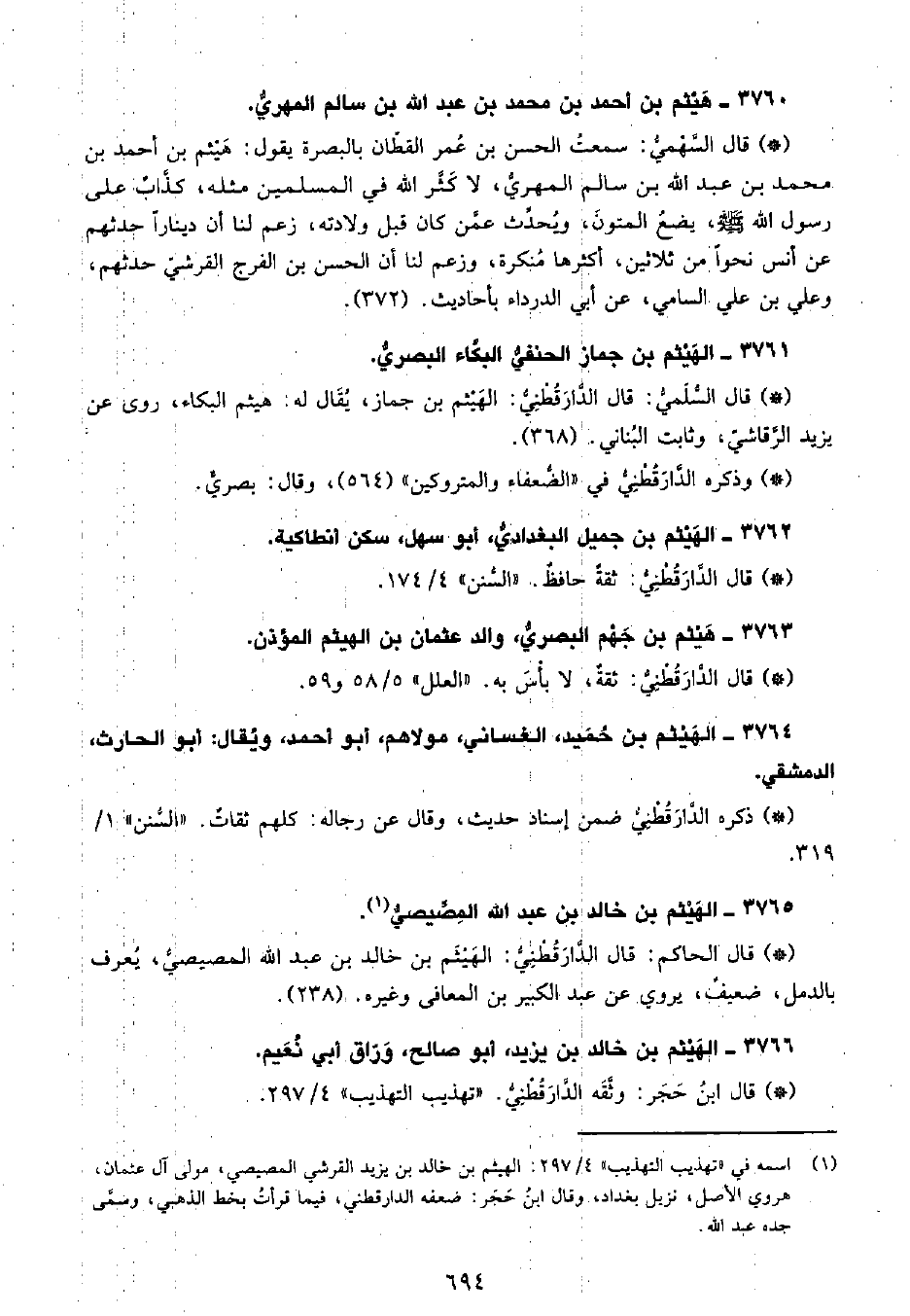 • قال الحاكم: قال الدَّارَقُطْنِيّ: الهيثم بن خالد بن عبد الله المصيصي، يعرف بالدمل، ضعيف، يروي عن عبد الكبير بن المعافى وغيره. (238) .