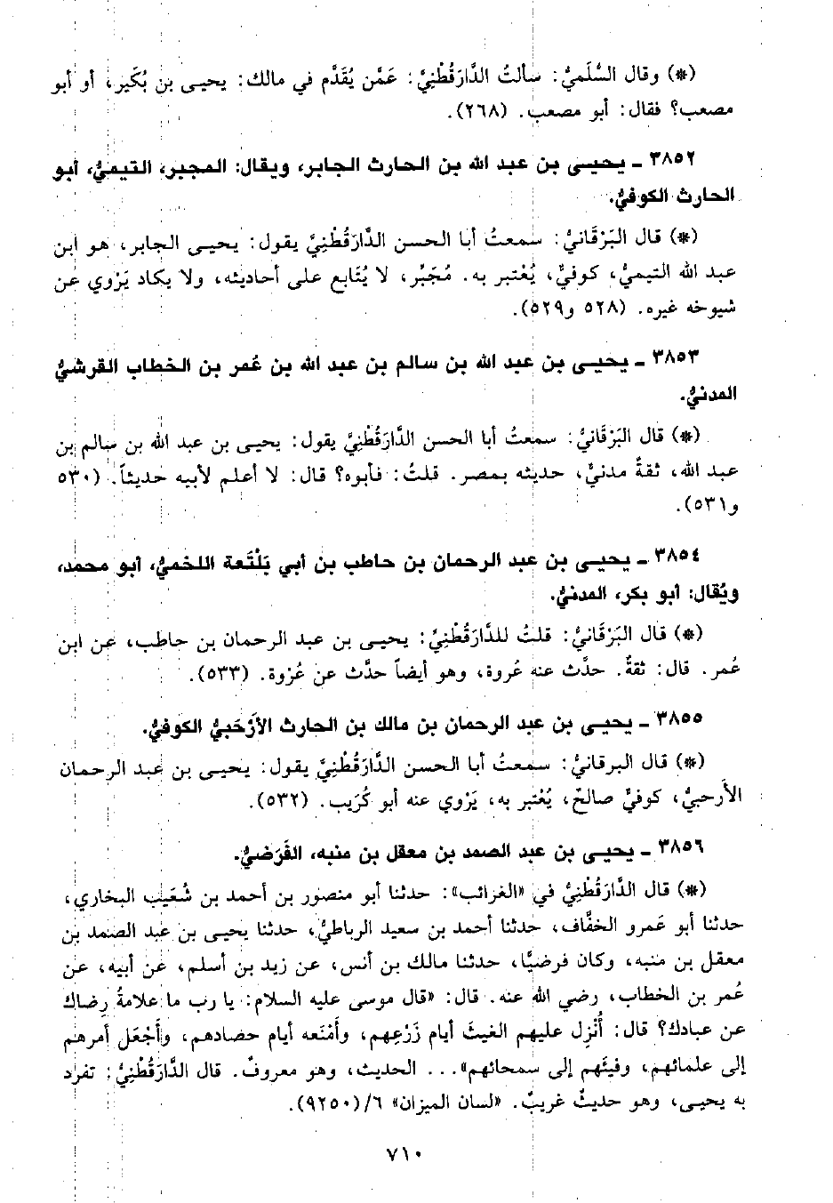 • قال البَرْقانِيّ: قلتُ للدَّارَقُطْنِيِّ يحيى بن عبد الرحمن بن حاطب، عن ابن عمر، قال ثقة، حدث عنه عروة، وهو أيضًا حدث عن عروة. (533) .