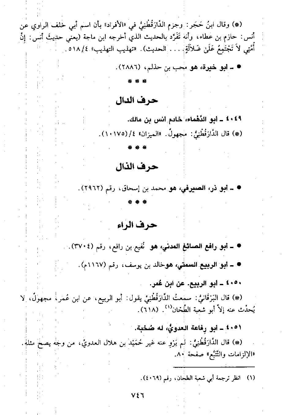 • قال البَرْقانِيّ: سَمِعْتُ الدَّارَقُطْنِيّ يقول أبو الربيع، عن ابن عمر، مجهول، لا يحدث عنه إلا أبو شعبة الطحان. (618) .