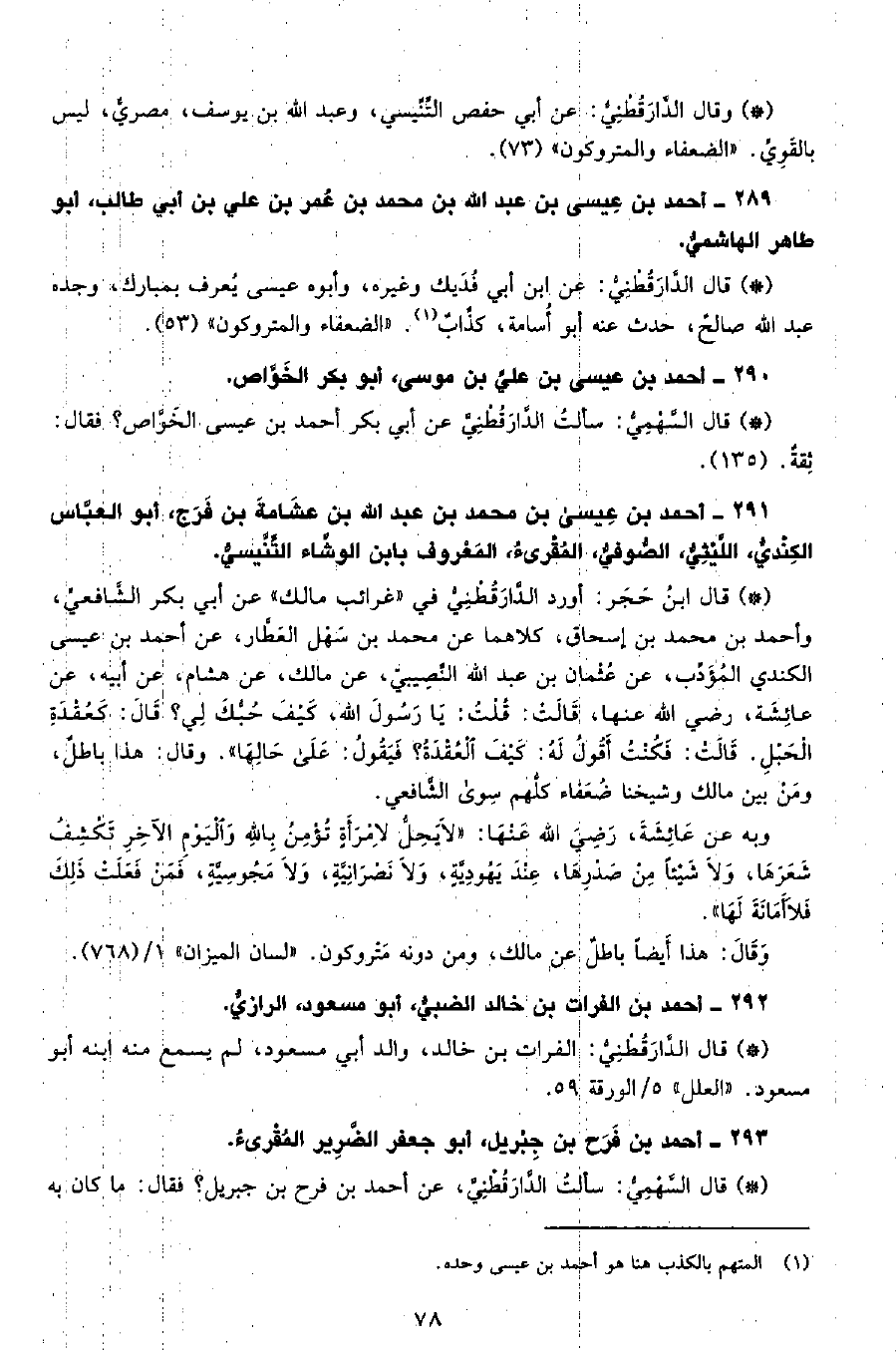• قال الدَّارَقُطْنِيّ: عن ابن أبي فديك وغيره، وأبوه عيسى يعرف بمبارك، وجده عبد الله صالح، حدث عنه أبو أسامة، كذاب. «الضعفاء والمتروكون» (53) .