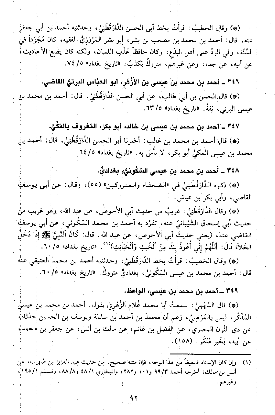 • وقال الخطيب: قرأت بخط الدَّارَقُطْنِيّ، وحدثنيه أحمد بن محمد العتيقي عنه، قال أحمد بن محمد بن عيسى السكوني، بغدادي متروك. «تاريخ بغداد» 5 60.