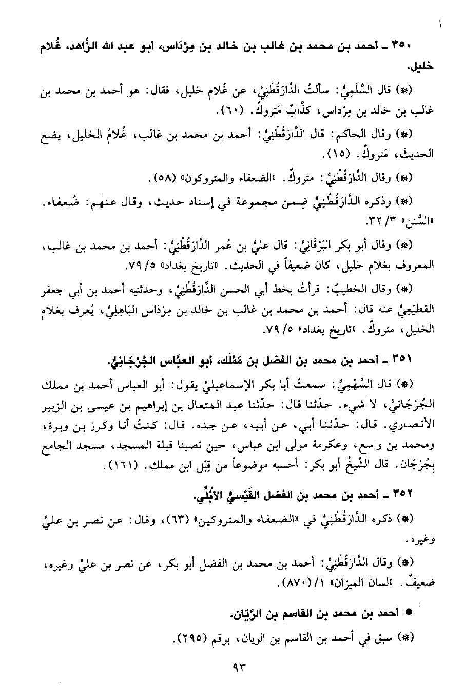 • وقال الدَّارَقُطْنِيّ: أحمد بن محمد بن الفضل أبو بكر، عن نصر بن علي وغيره، ضعيف. «لسان الميزان» 1 (870) .