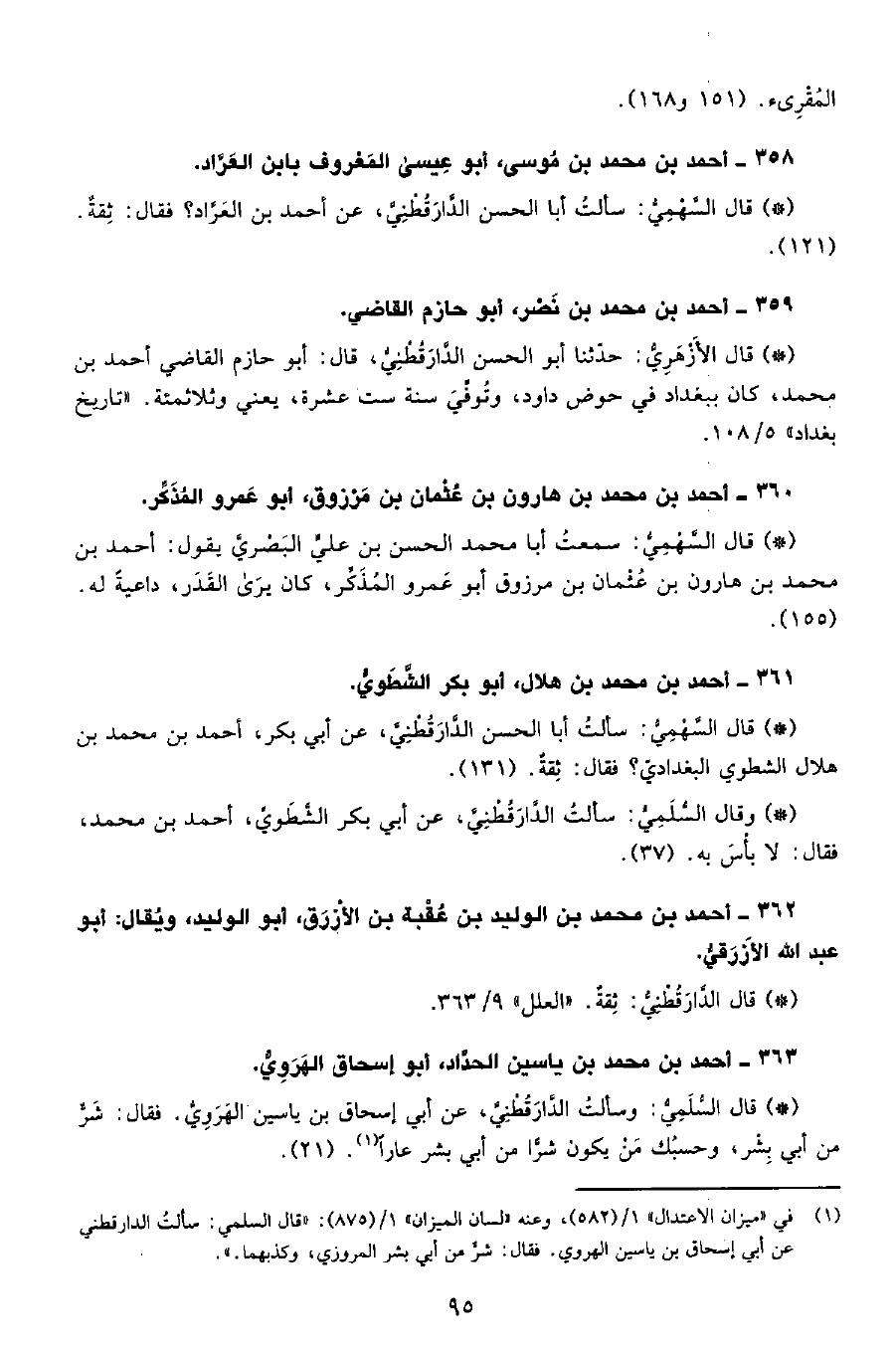 • قال السهمي: سألت أبا الحسن الدَّارَقُطْنِيّ، عن أحمد بن العراد؟ فقال: ثقة. (121) .