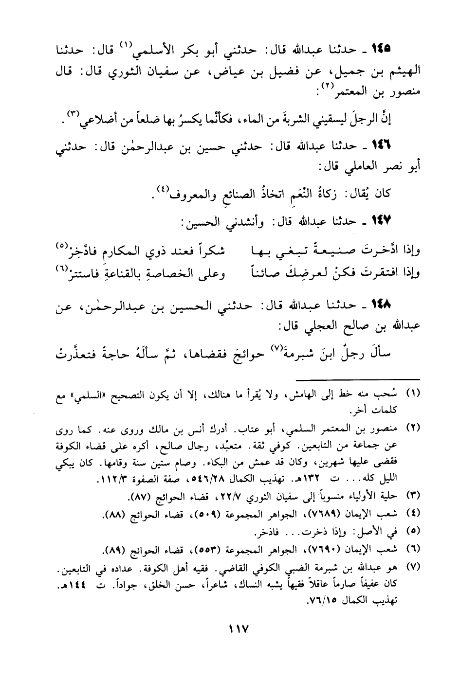 148 - حَدَّثَنَا عبد الله قال حَدَّثَنِي الْحُسَيْنُ بْنُ عَبْدِ الرَّحْمَنِ عَنْ عَبْدِ اللَّهِ بْنِ صَالِحٍ العجلي قال سأل ابْنَ شُبْرُمَةَ حَوَائِجَ فَقَضَاهَا ثُمَّ سَأَلَهُ حَاجَةً فَتَعَذَّرَتْ -[118]- عَلَيْهِ فَلَامَهُ فَقَالَ حِبَّانُ بْنُ عَلِيٍّ وَاللَّهِ إِنَّ رَجُلًا مَنَعَهُ شُكْرًا كَثِيرًا أُولِيهِ قَلِيلٌ مُنِعَهُ لَقَلِيلُ الشُّكْرِ فَقَالَ ابْنُ شُبْرُمَةَ هَذَا وَاللَّهِ رَجُلُ أَهْلِ الْكُوفَةِ بَعْدَ قَلِيلٍ.
