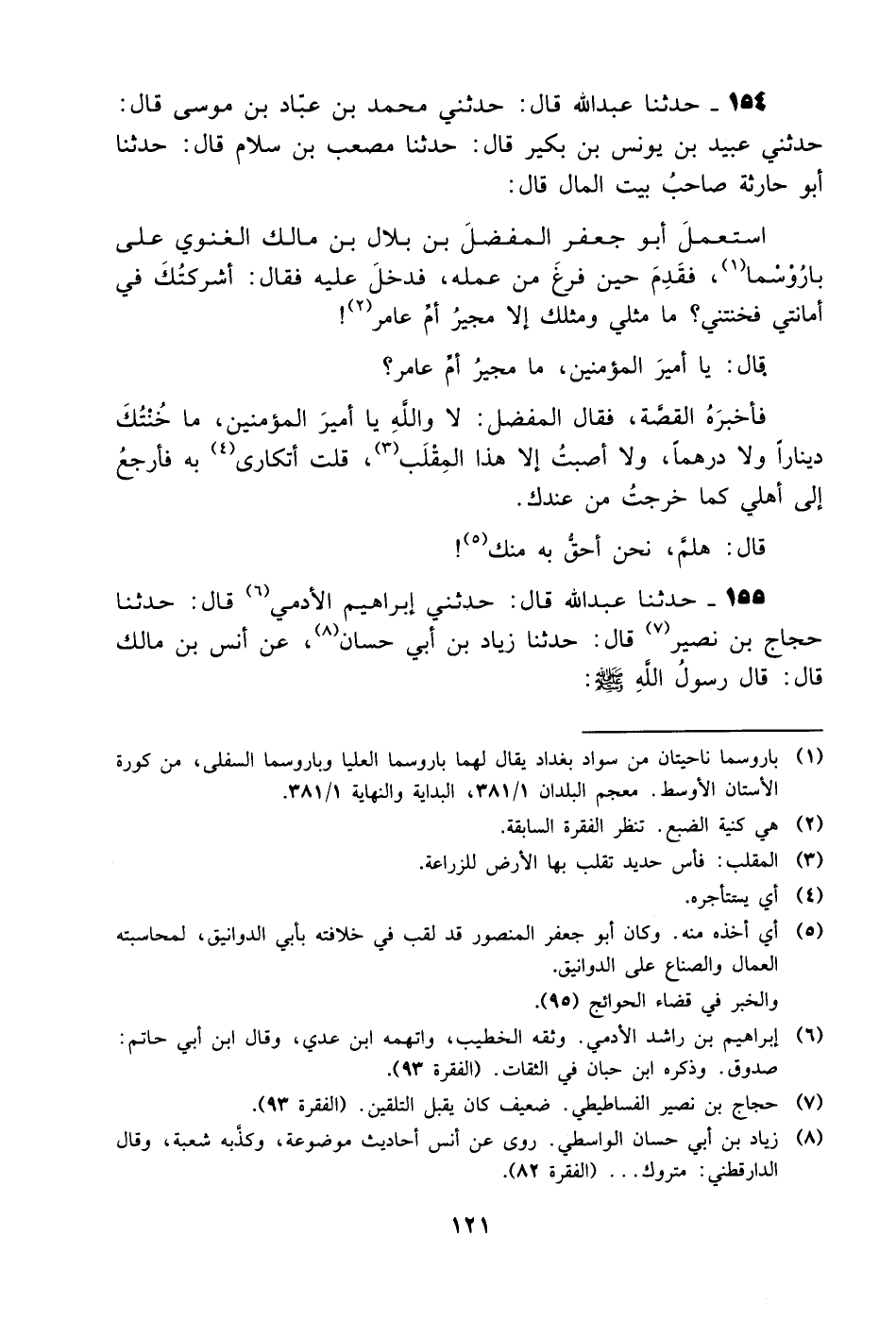 154 - حَدَّثَنَا عبد الله قال حدثني محمد بْنُ عَبَّادِ بْنِ مُوسَى قَالَ حَدَّثَنِي عُبَيْدُ بْنُ يُونُسَ بْنِ بُكَيْرٍ قَالَ حَدَّثَنَا مُصْعَبُ بْنُ سَلَامٍ قَالَ حَدَّثَنَا أَبُو حَارِثَةَ صَاحِبُ بَيْتِ الْمَالِ قَالَ اسْتَعْمَلَ أَبُو جَعْفَرٍ الْمُفَضَّلَ بْنَ بِلَالِ بن مالك الغنوي على باروسما فَقَدِمَ حِينَ فَرَغَ مِنْ عَمَلِهِ فَدَخَلَ عَلَيْهِ فَقَالَ أَشْرَكْتُكَ فِي أَمَانَتِي فَخُنْتَنِي مَا مَثَلِي وَمَثَلُكَ إِلَّا مُجِيرُ أُمِّ عَامِرٍ قَالَ يَا أَمِيرَ الْمُؤْمِنِينَ مَا مُجِيرُ أُمِّ عَامِرٍ فَأَخْبَرَهُ الْقِصَّةَ فَقَالَ الْمُفَضَّلُ لَا وَاللَّهِ يَا أَمِيرَ الْمُؤْمِنِينَ مَا خُنْتُكَ دِينَارًا وَلَا دِرْهَمًا وَلَا أَصَبْتُ إِلَّا هَذَا الْمِقْلَبَ قُلْتُ أَتَكَارَى بِهِ فَأَرْجِعُ إِلَى أَهْلِي كَمَا خَرَجْتُ مِنْ عِنْدِكَ قَالَ هَلُمَّ نَحْنُ أَحَقُّ به منك.