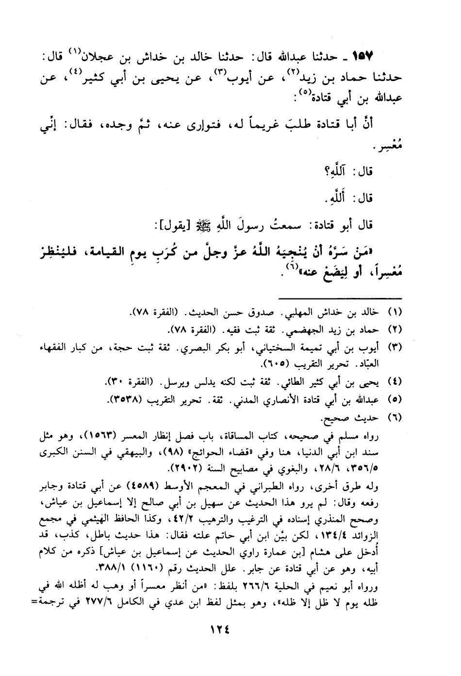 157 - حَدَّثَنَا عبد الله قال حَدَّثَنَا خَالِدُ بْنُ خِدَاشِ بْنِ عَجْلَانَ قَالَ حَدَّثَنَا حَمَّادُ بْنُ زَيْدٍ عَنْ أَيُّوبَ عَنْ يَحْيَى بْنِ أَبِي كَثِيرٍ عَنْ عَبْدِ اللَّهِ بْنِ أَبِي قَتَادَةَ أَنَّ أَبَا قَتَادَةَ طَلَبَ غَرِيمًا لَهُ فَتَوَارَى عَنْهُ ثُمَّ وَجَدَهُ فَقَالَ إِنِّي مُعْسِرٌ قَالَ آللَّهِ قَالَ أَللَّهِ قَالَ أَبُو قَتَادَةَ سَمِعْتُ رَسُولُ اللَّهِ صَلَّى اللَّهُ عَلَيْهِ وَسَلَّمَ [يَقُولُ] مَنْ سَرَّهُ أَنْ يُنْجِيَهُ اللَّهُ عَزَّ وَجَلَّ مِنْ كُرَبِ يَوْمِ الْقِيَامَةِ فَلْيُنْظِرْ مُعْسِرًا أو ليضع عنه.