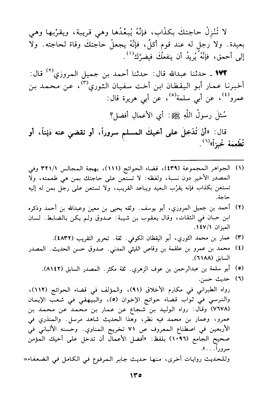 172 - حَدَّثَنَا عبد الله قال حَدَّثَنَا أَحْمَدُ بْنُ جَمِيلٍ الْمَرْوَزِيُّ قَالَ أَخْبَرَنَا عَمَّارٌ أَبُو الْيَقْظَانِ ابْنُ أُخْتِ سُفْيَانَ الثَّوْرِيُّ عَنْ مُحَمَّدِ بْنِ عَمْرٍو عَنْ أَبِي سَلَمَةَ عَنْ أَبِي هُرَيْرَةَ قَالَ سُئِلَ رَسُولُ اللَّهِ صَلَّى اللَّهُ عَلَيْهِ وَسَلَّمَ أَيُّ الْأَعْمَالِ أَفْضَلُ قَالَ أَنْ تُدْخِلَ عَلَى أَخِيكَ الْمُسْلِمِ سُرُورًا أَوْ تَقْضِيَ عَنْهُ دَيْنًا أَوْ تُطْعِمَهُ خُبْزًا.