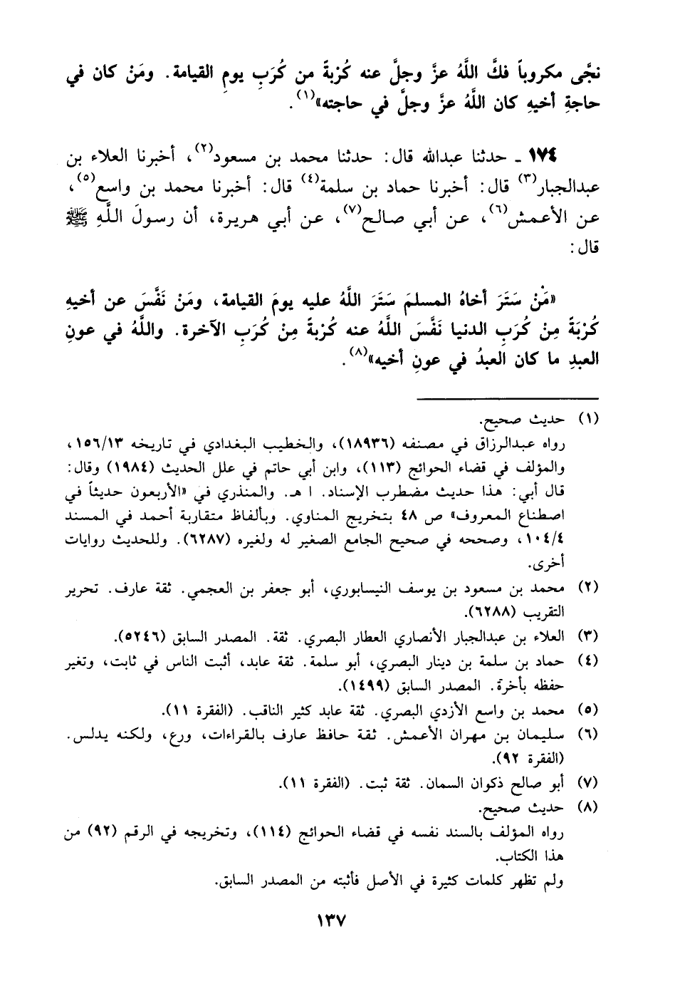 174 - حَدَّثَنَا عَبْدُ اللَّهِ قَالَ حَدَّثَنَا مُحَمَّدُ بْنُ مَسْعُودٍ أَخْبَرَنَا الْعَلَاءُ بْنُ عَبْدِ الْجَبَّارِ قَالَ أَخْبَرَنَا حَمَّادُ بْنُ سَلَمَةَ قَالَ أَخْبَرَنَا مُحَمَّدُ بْنُ وَاسِعٍ عَنِ الْأَعْمَشِ عَنْ أَبِي صَالِحٍ عَنْ أَبِي هُرَيْرَةَ أَنَّ رَسُولَ اللَّهِ صَلَّى اللَّهُ عَلَيْهِ وَسَلَّمَ قَالَ مَنْ سَتَرَ أَخَاهُ الْمُسْلِمَ سَتَرَ اللَّهُ عَلَيْهِ يَوْمَ الْقِيَامَةِ وَمَنْ نَفَّسَ عَنْ أَخِيهِ كُرْبَةً مِنْ كُرَبِ الدُّنْيَا نَفَّسَ اللَّهُ عَنْهُ كُرْبَةً مِنْ كُرَبِ الْآخِرَةِ وَاللَّهُ فِي عَوْنِ الْعَبْدِ مَا كَانَ الْعَبْدُ فِي عون أخيه.