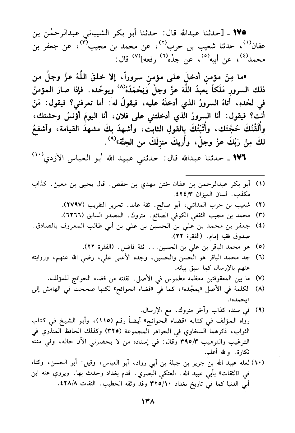 175 - [حَدَّثَنَا عَبْدُ اللَّهِ قَالَ حَدَّثَنَا أَبُو بَكْرٍ الشَّيْبَانِيُّ عَبْدُ الرَّحْمَنِ بْنُ عَفَّانَ حَدَّثَنَا شُعَيْبُ بْنُ حَرْبٍ عَنْ مُحَمَّدِ بْنِ مُجِيبٍ عَنْ جَعْفَرِ بْنِ مُحَمَّدٍ عَنْ أَبِيهِ عَنْ جَدِّهِ رَفَعَهُ] قَالَ: مَا مِنْ مُؤْمِنٍ أَدْخَلَ عَلَى مُؤْمِنٍ سُرُورًا إِلَّا خَلَقَ اللَّهُ عَزَّ وَجَلَّ مِنْ ذَلِكَ السُّرُورِ مَلَكًا يَعْبُدُ اللَّهَ عَزَّ وَجَلَّ وَيَحْمَدُهُ وَيُوَحِّدُهُ فَإِذَا صَارَ الْمُؤْمِنُ فِي لَحْدِهِ أَتَاهُ السُّرُورُ الَّذِي أَدْخَلَهُ عَلَيْهِ فَيَقُولُ لَهُ أَمَا تَعْرِفُنِي فَيَقُولُ مَنْ أَنْتَ فَيَقُولُ أَنَا السُّرُورُ الَّذِي أَدْخَلْتَنِي عَلَى فُلَانٍ أَنَا الْيَوْمَ أُؤْنِسُ وَحْشَتَكَ وَأُلَقِّنُكَ حُجَّتَكَ وَأُثَبِّتُكَ بِالْقَوْلِ الثَّابِتِ وَأَشْهَدُ بِكَ مَشْهَدَ الْقِيَامَةِ وَأَشْفَعُ لَكَ مِنْ رَبِّكَ عَزَّ وَجَلَّ وَأُرِيكَ منزلك من الجنة.