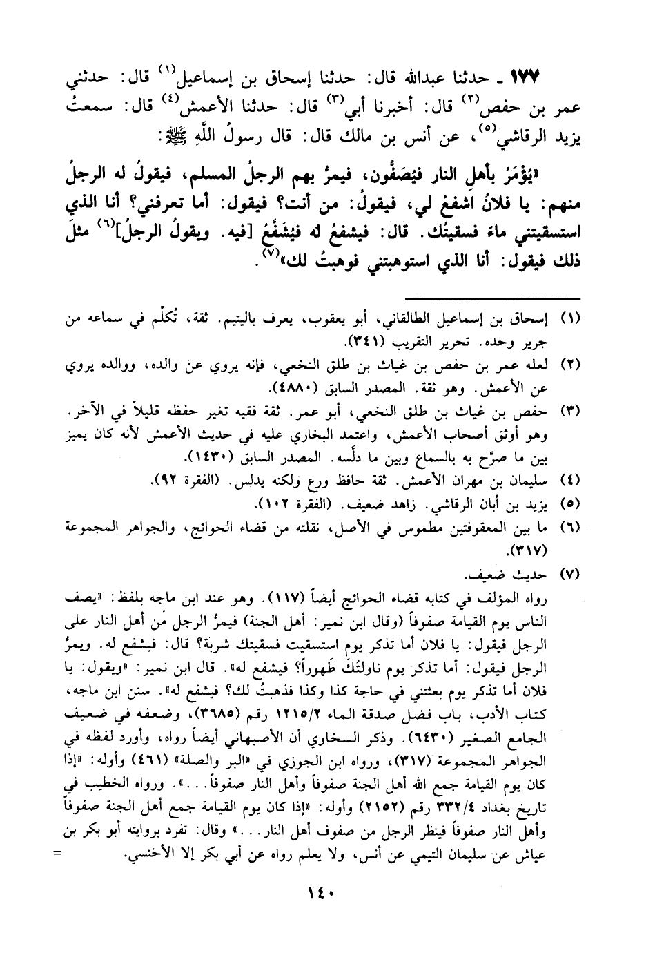 177 - حَدَّثَنَا عبد الله قال حَدَّثَنَا إِسْحَاقُ بْنُ إِسْمَاعِيلَ قَالَ حَدَّثَنِي عُمَرُ بْنُ حَفْصٍ قَالَ أَخْبَرَنَا أَبِي قَالَ حَدَّثَنَا الْأَعْمَشُ قَالَ سَمِعْتُ يَزِيدَ الرُّقَاشِيَّ عَنْ أَنَسِ بْنِ مَالِكٍ قَالَ قَالَ رَسُولُ اللَّهِ صَلَّى اللَّهُ عَلَيْهِ وَسَلَّمَ يُؤْمَرُ بِأَهْلِ النَّارِ فَيُصَفُّونَ فَيَمُرُّ بِهِمُ الرَّجُلُ الْمُسْلِمُ فَيَقُولُ لَهُ الرَّجُلُ مِنْهُمْ يَا فُلَانُ اشْفَعْ لِي فَيَقُولُ مَنْ أَنْتَ فَيَقُولُ أَمَا تَعْرِفُنِي أَنَا الَّذِي اسْتَسْقَيْتَنِي مَاءً فَسَقَيْتُكَ قَالَ فَيَشْفَعُ لَهُ فَيُشَفَّعُ [فِيهِ وَيَقُولُ الرَّجُلُ] مِثْلَ ذَلِكَ فَيَقُولُ أَنَا الَّذِي استوهبتني فوهبت لك.