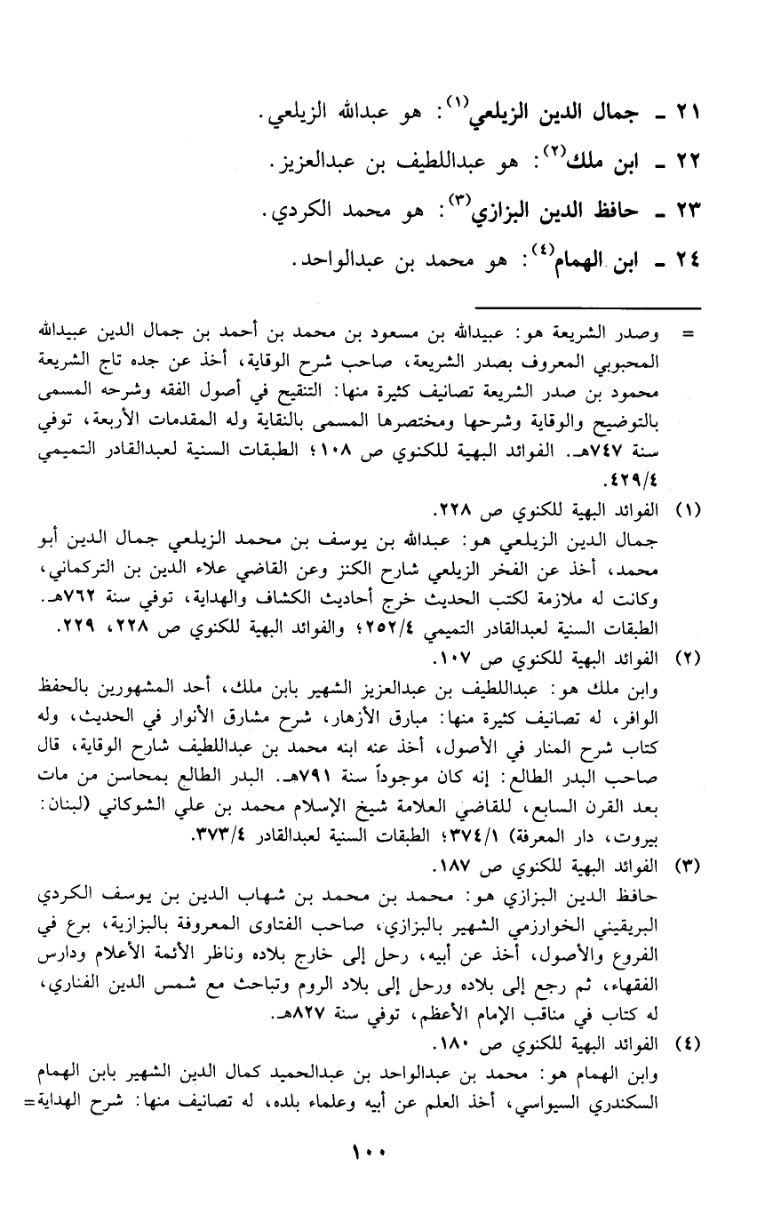 (¬2) الفوائد البهية للكنوي ص 107. وابن ملك هو: عبد اللطيف بن عبد العزيز الشهير بابن ملك، أحد المشهورين بالحفظ الوافر، له تصانيف كثيرة منها: مبارق الأزهار، شرح مشارق الأنوار في الحديث، وله كتاب شرح المنار في الأصول، أخذ عنه ابنه محمد بن عبد اللطيف شارح الوقاية، قال صاحب البدر الطالع: إنه كان موجودا سنة 791 هـ. البدر الطالع بمحاسن من مات بعد القرن السابع، للقاضي العلامة شيخ الإسلام محمد بن علي الشوكاني (لبنان: بيروت، دار المعرفة) 1/ 374؛ الطبقات السنية لعبد القادر 4/ 373.