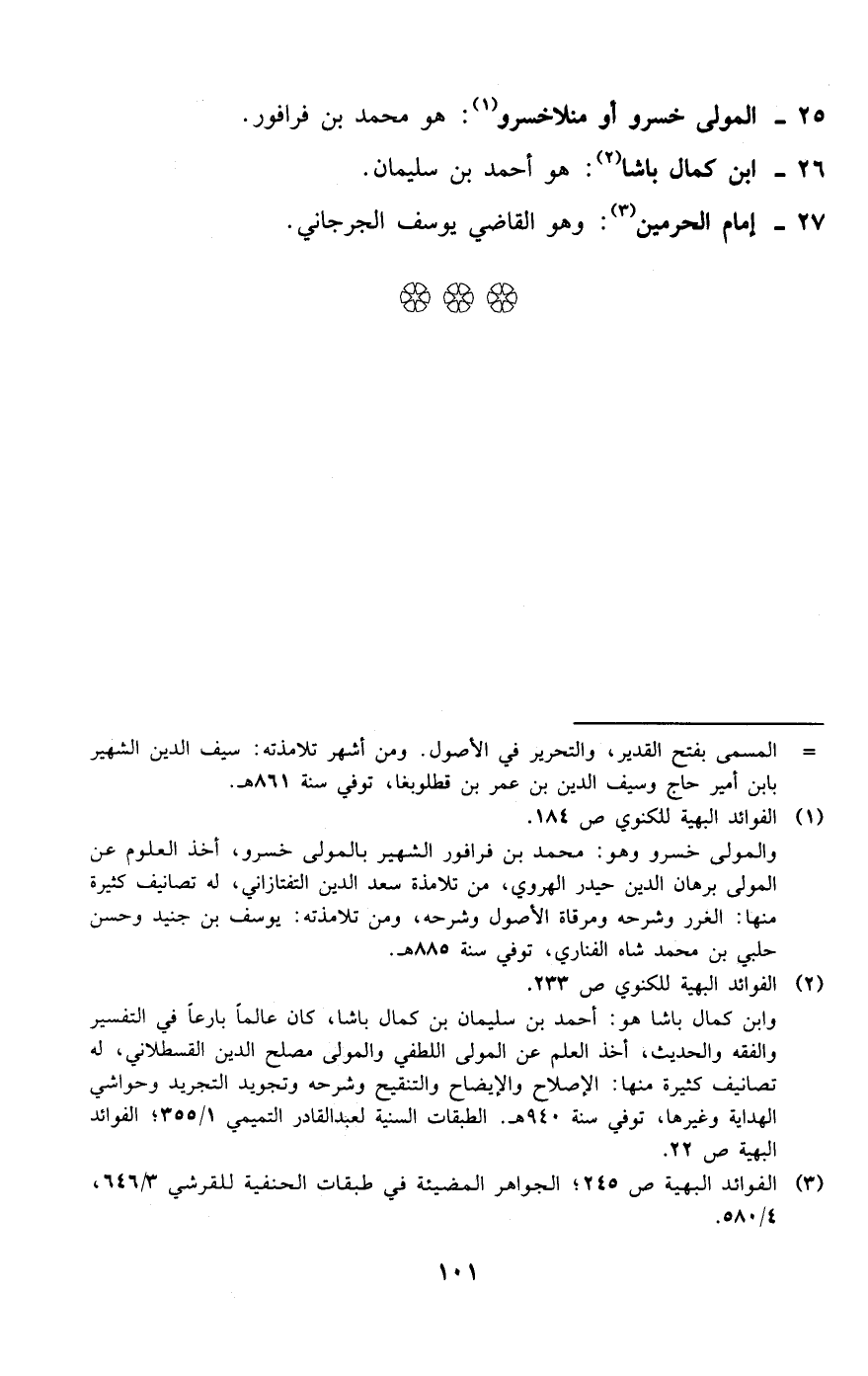 (¬2) الفوائد البهية للكنوي ص 233. وابن كمال باشا هو: أحمد بن سليمان بن كمال باشا، كان عالما بارعا في التفسير والفقه والحديث، أخذ العلم عن المولى اللطفي والمولى مصلح الدين القسطلاني، له تصانيف كثيرة منها: الإصلاح والإيضاح والتنقيح وشرحه وتجويد التجريد وحواشي الهداية وغيرها، توفي سنة 940 هـ. الطبقات السنية لعبد القادر التميمي 1/ 355؛ الفوائد البهية ص 22.