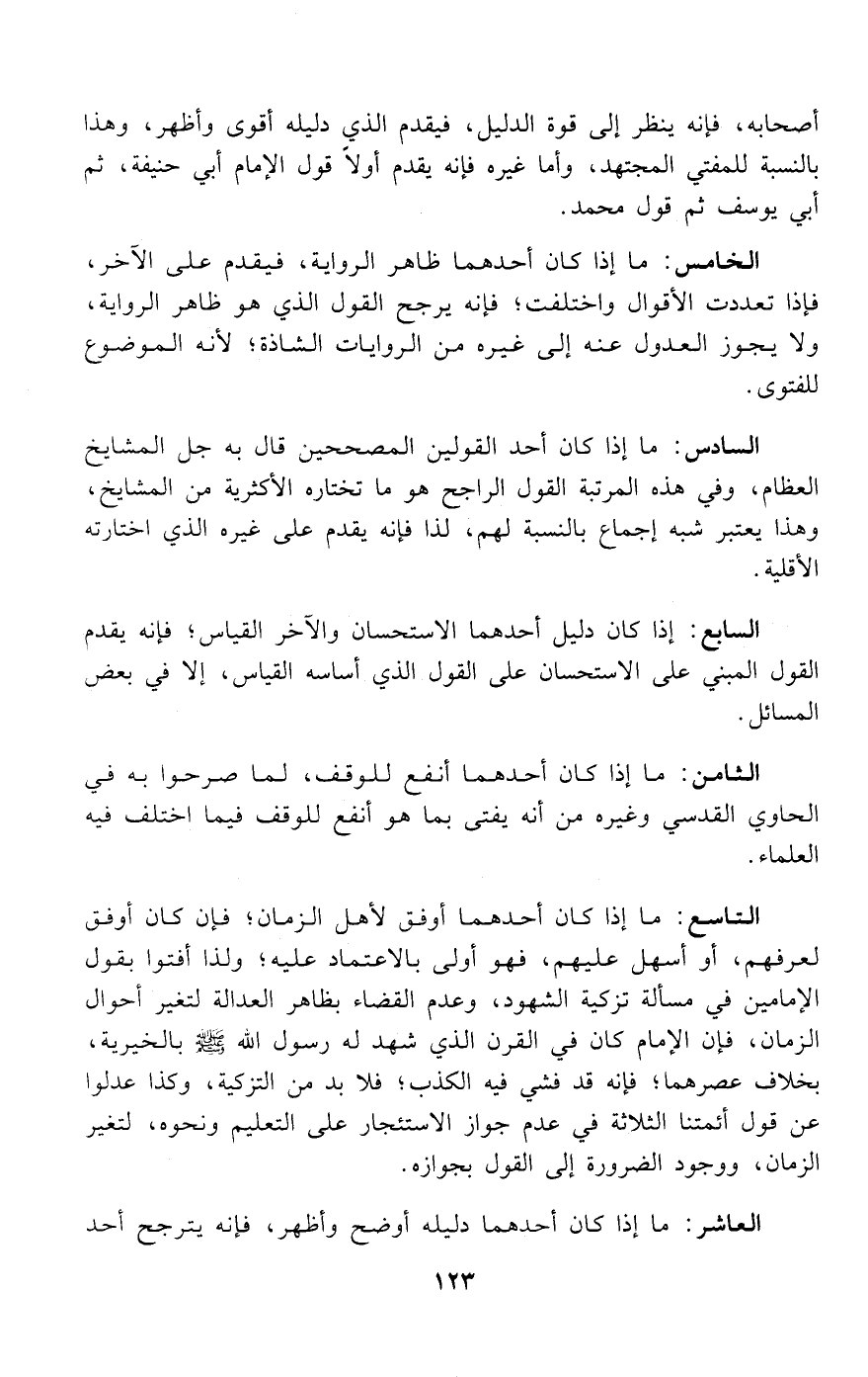التاسع: ما إذا كان أحدهما أوفق لأهل الزمان؛ فإن كان أوفق لعرفهم، أو أسهل عليهم، فهو أولى بالاعتماد عليه؛ ولذا أفتوا بقول الإمامين في مسألة تزكية الشهود، وعدم القضاء بظاهر العدالة لتغير أحوال الزمان، فإن الإمام كان في القرن الذي شهد له رسول الله صلى الله عليه وسلم بالخيرية، بخلاف عصرهما؛ فإنه قد فشي فيه الكذب؛ فلا بد من التزكية، وكذا عدلوا عن قول أئمتنا الثلاثة في عدم جواز الاستئجار على التعليم ونحوه، لتغير الزمان، ووجود الضرورة إلى القول بجوازه.