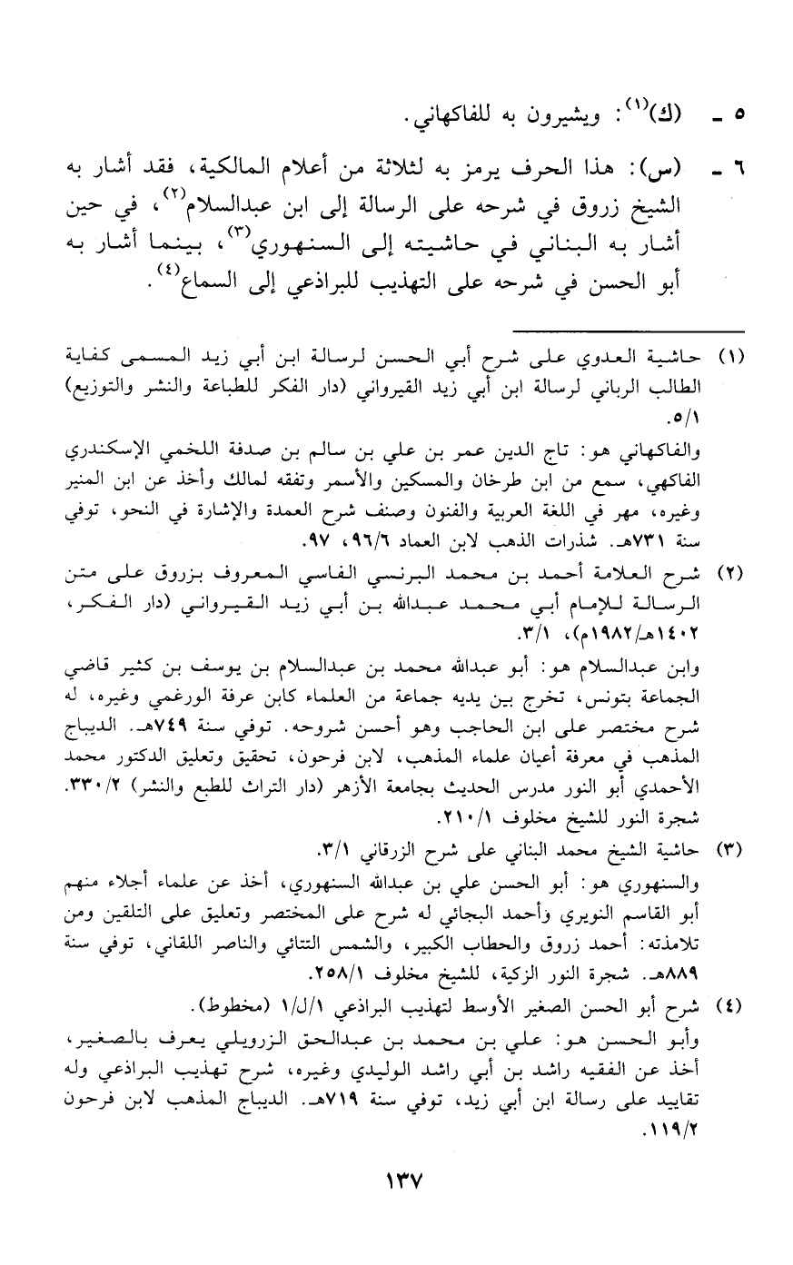 (¬2) شرح العلامة أحمد بن محمد البرنسي الفاسي المعروف بزروق على متن الرسالة للإمام أبي محمد عبد الله بن أبي زيد القيرواني (دار الفكر، 1402 هـ/1982 م)،1/ 3. وابن عبد السلام هو: أبو عبد الله محمد بن عبد السلام بن يوسف بن كثير قاضي الجماعة بتونس، تخرج بين يديه جماعة من العلماء كابن عرفة الورغمي وغيره، له شرح مختصر على ابن الحاجب وهو أحسن شروحه. توفي سنة 749 هـ. الديباج المذهب في معرفة أعيان علماء المذهب، لابن فرحون، تحقيق وتعليق الدكتور محمد الأحمدي أبو النور مدرس الحديث بجامعة الأزهر (دار التراث للطبع والنشر) 2/ 330. شجرة النور للشيخ مخلوف 1/ 210.