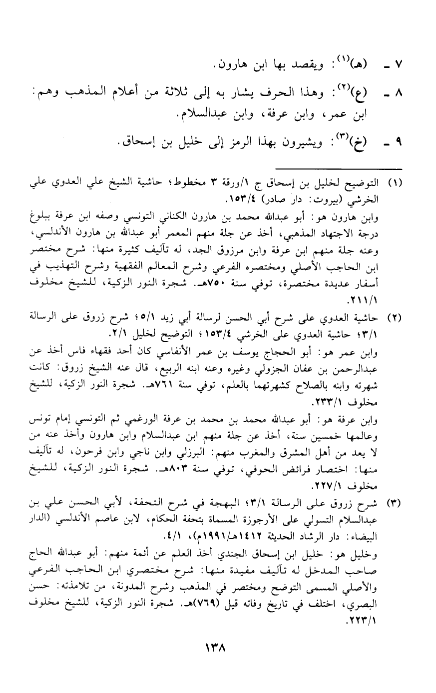 (¬1) التوضيح لخليل بن إسحاق ج 1/ورقة 3 مخطوط؛ حاشية الشيخ علي العدوي علي الخرشي (بيروت: دار صادر) 4/ 153. وابن هارون هو: أبو عبد الله محمد بن هارون الكناني التونسي وصفه ابن عرفة ببلوغ درجة الاجتهاد المذهبي، أخذ عن جلة منهم المعمر أبو عبد الله بن هارون الأندلسي، وعنه جلة منهم ابن عرفة وابن مرزوق الجد، له تآليف كثيرة منها: شرح مختصر ابن الحاجب الأصلي ومختصره الفرعي وشرح المعالم الفقهية وشرح التهذيب في أسفار عديدة مختصرة، توفي سنة 750 هـ. شجرة النور الزكية، للشيخ مخلوف 1/ 211.