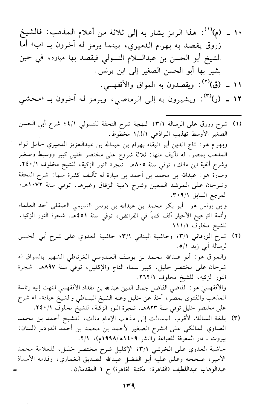10 - (م) (¬1): هذا الرمز يشار به إلى ثلاثة من أعلام المذهب: فالشيخ زروق يقصد به بهرام الدميري، بينما يرمز له آخرون ب «ب» أما الشيخ أبو الحسن بن عبد السلام التسولي فيقصد بها مياره، في حين يشير بها أبو الحسن الصغير إلى ابن يونس.