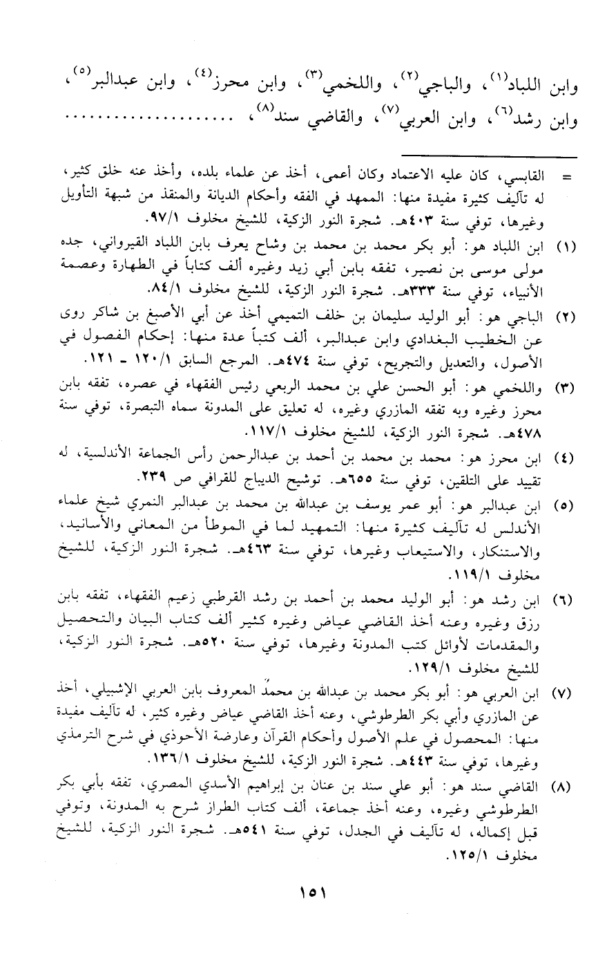 (¬6) ابن رشد هو: أبو الوليد محمد بن أحمد بن رشد القرطبي زعيم الفقهاء، تفقه بابن رزق وغيره وعنه أخذ القاضي عياض وغيره كثير ألف كتاب البيان والتحصيل والمقدمات لأوائل كتب المدونة وغيرها، توفي سنة 520 هـ. شجرة النور الزكية، للشيخ مخلوف 1/ 129.