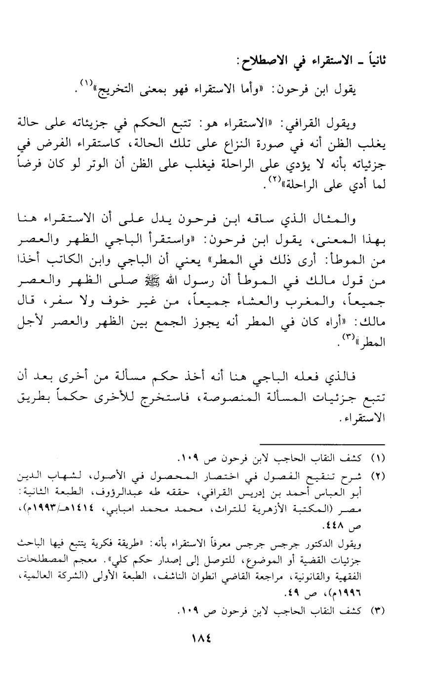 (¬2) شرح تنقيح الفصول في اختصار المحصول في الأصول، لشهاب الدين أبو العباس أحمد بن إدريس القرافي، حققه طه عبد الرؤوف، الطبعة الثانية: مصر (المكتبة الأزهرية للتراث، محمد محمد امبابي،1414 هـ/1993 م)، ص 448. ويقول الدكتور جرجس معرفا الاستقراء بأنه: «طريقة فكرية يتتبع فيها الباحث جزئيات القضية أو الموضوع، للتوصل إلى إصدار حكم كلي». معجم المصطلحات الفقهية والقانونية، مراجعة القاضي انطوان الناشف، الطبعة الأولى (الشركة العالمية، 1996 م)، ص 49.