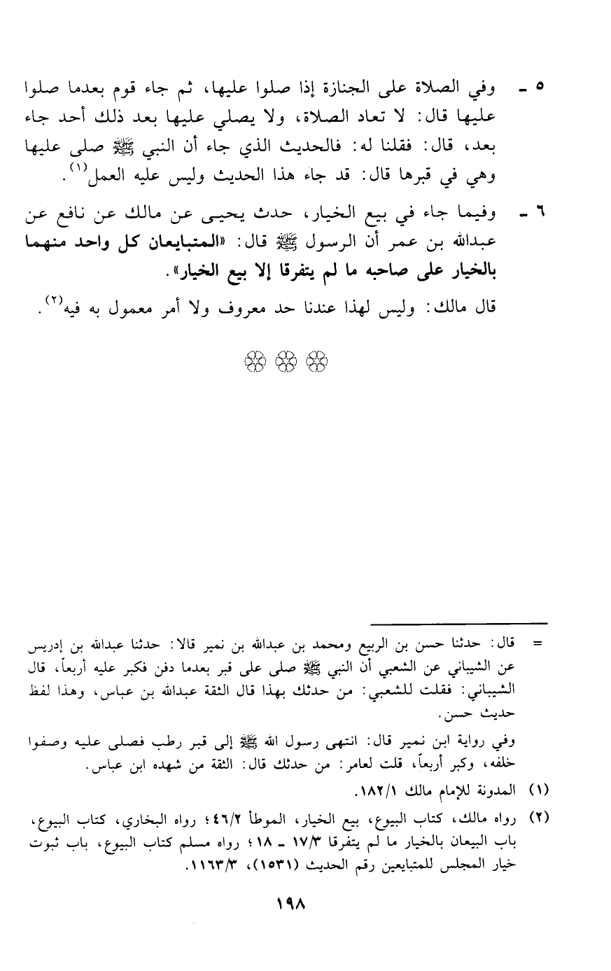 (¬2) رواه مالك، كتاب البيوع، بيع الخيار، الموطأ 2/ 46؛ رواه البخاري، كتاب البيوع، باب البيعان بالخيار ما لم يتفرقا 3/ 17 - 18؛ رواه مسلم كتاب البيوع، باب ثبوت خيار المجلس للمتبايعين رقم الحديث (1531)،3/ 1163.
